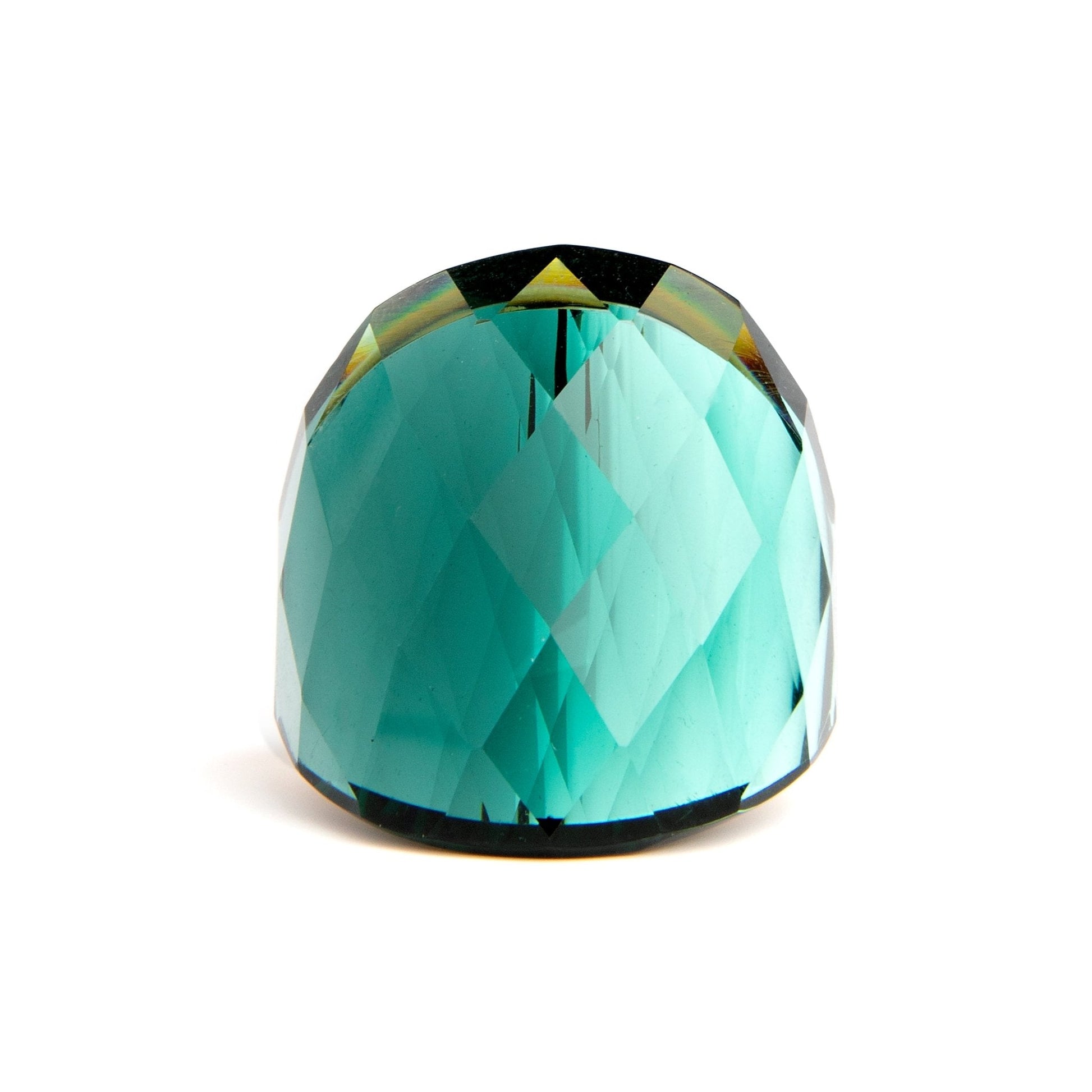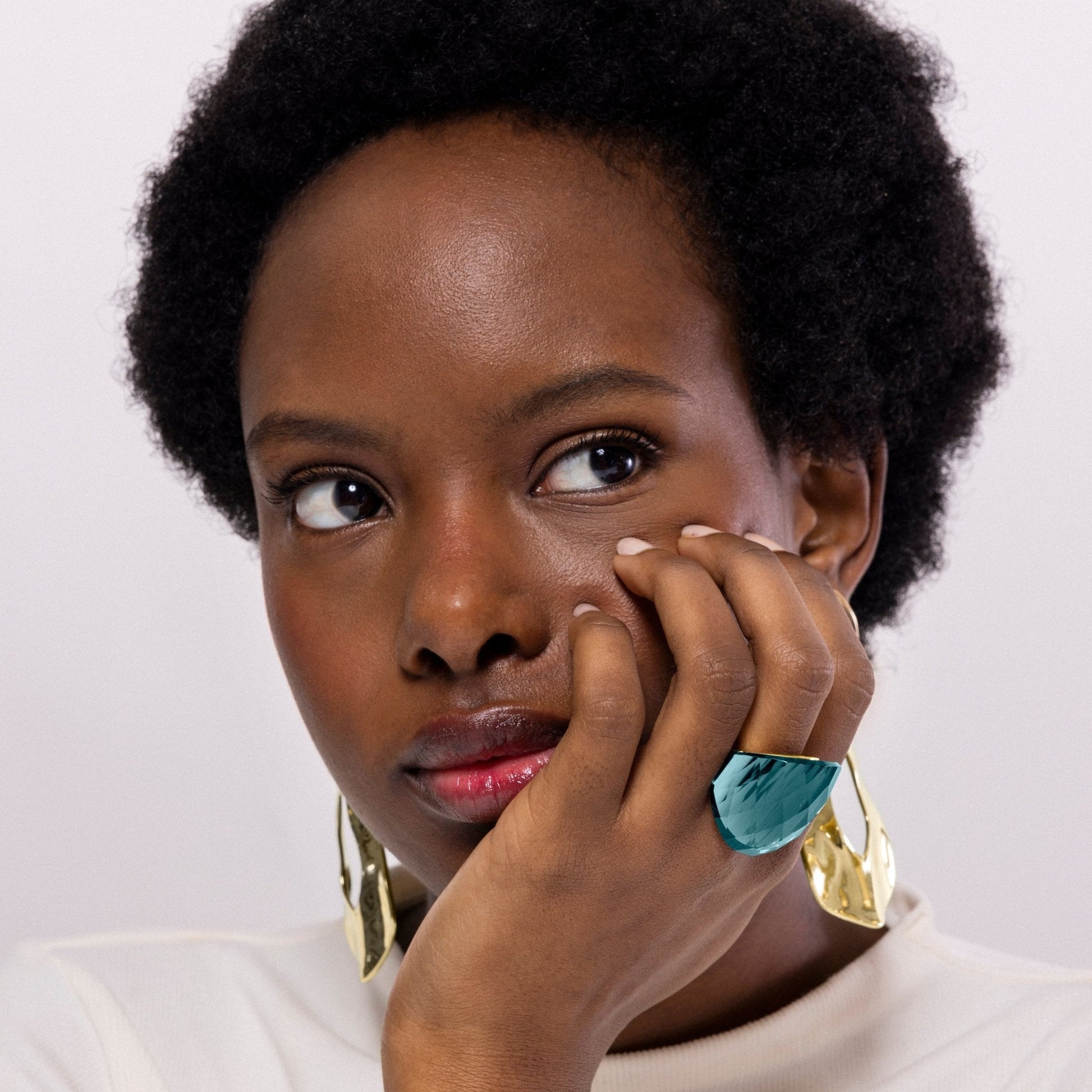 Anillo de metal Konsil con Cuarzo Hidrotermal Verde acabado en oro amarillo de 18K. África se convierte en la línea perfecta para mujeres con personalidad, que no temen arriesgar y lucir piezas con carácter propio.