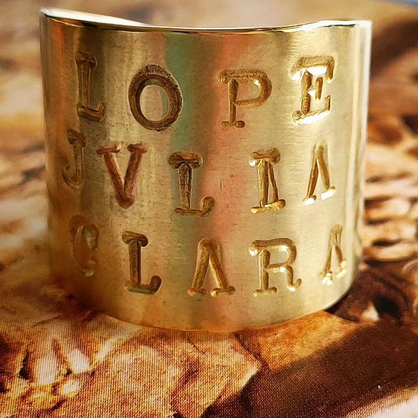 Anillo fabricado a mano y personalizado con cinceles de letras y números romanos.