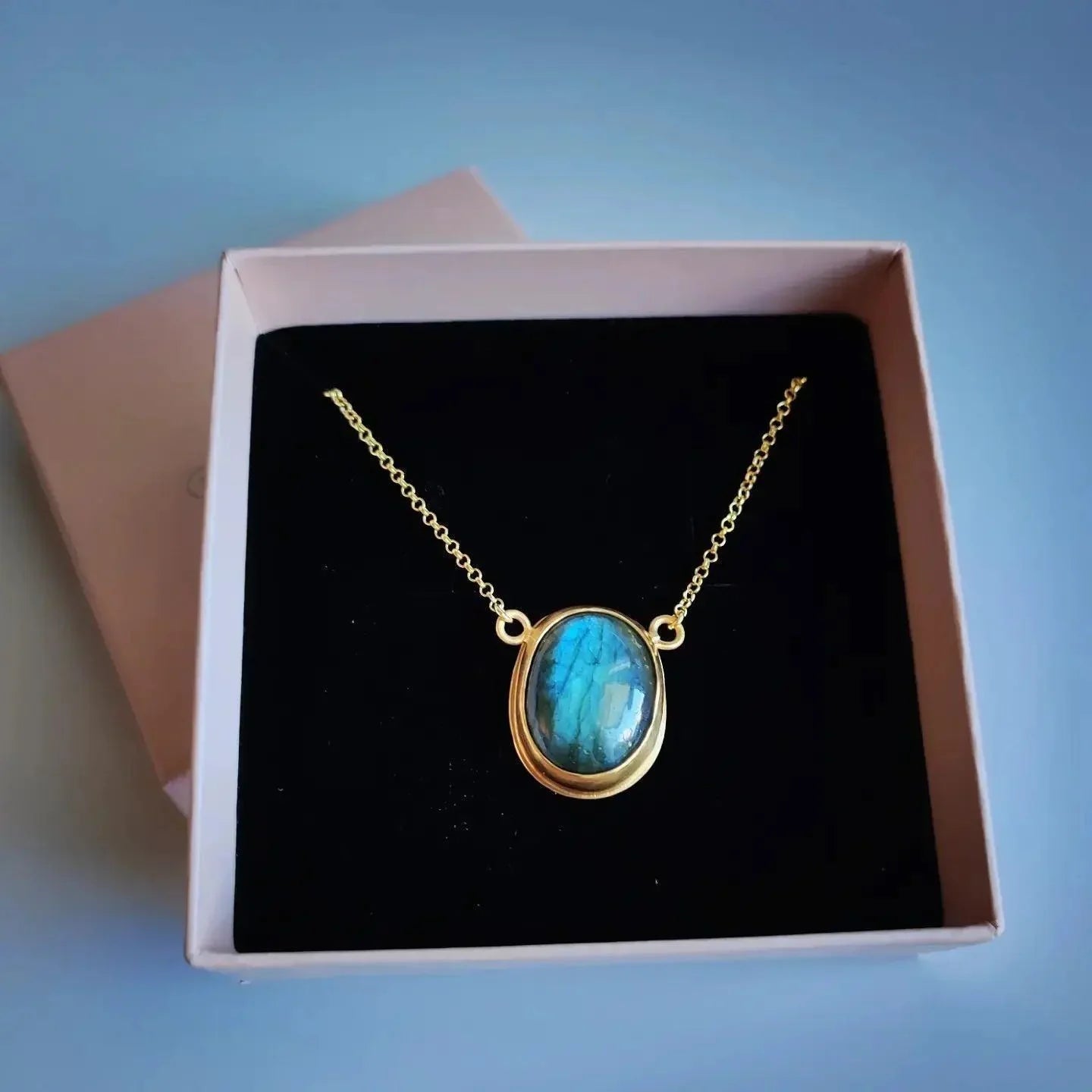 Colgante hecho con una Labradorita y abierto por detrás para que destaque el color azul incandescente cuando la luz atraviese el cristal.