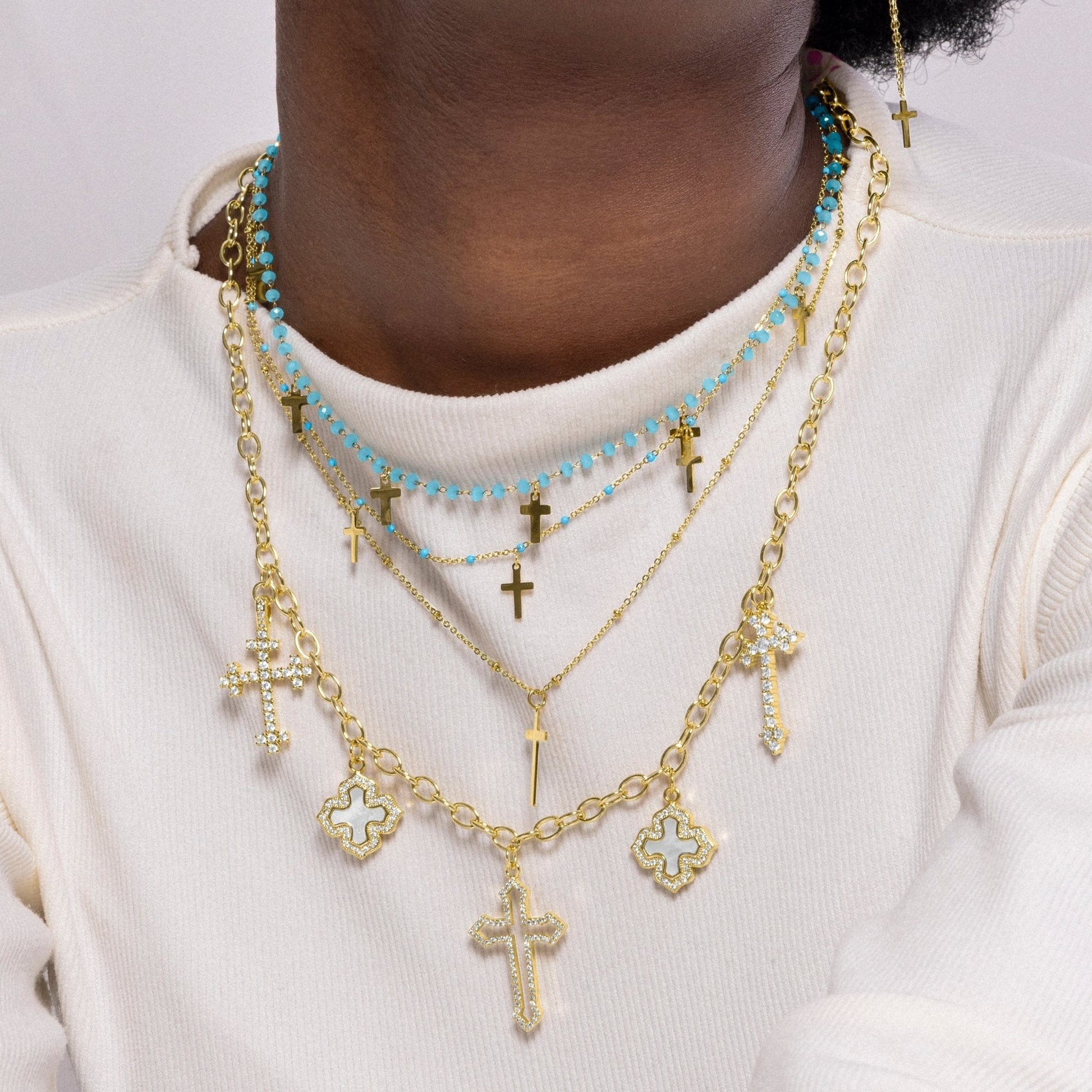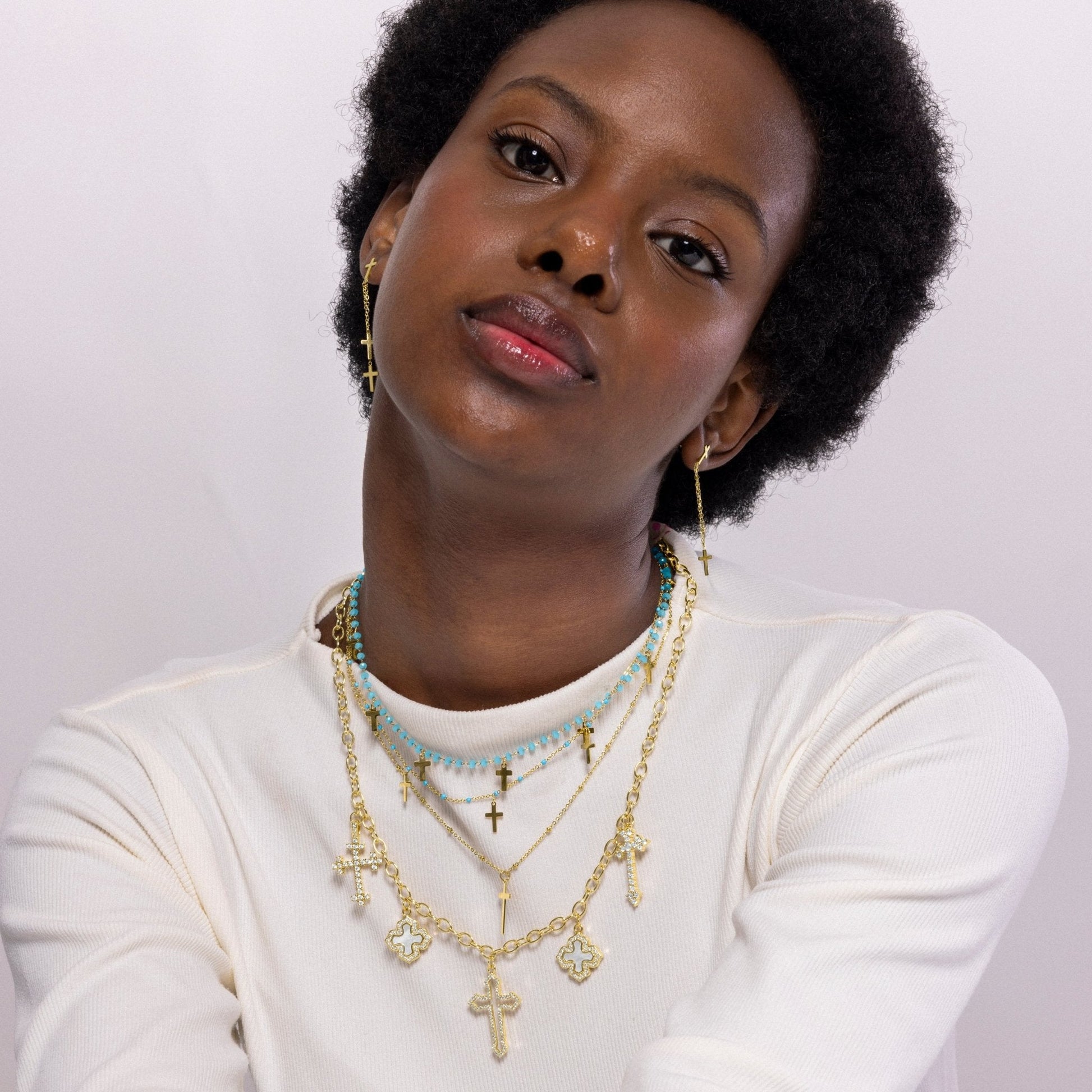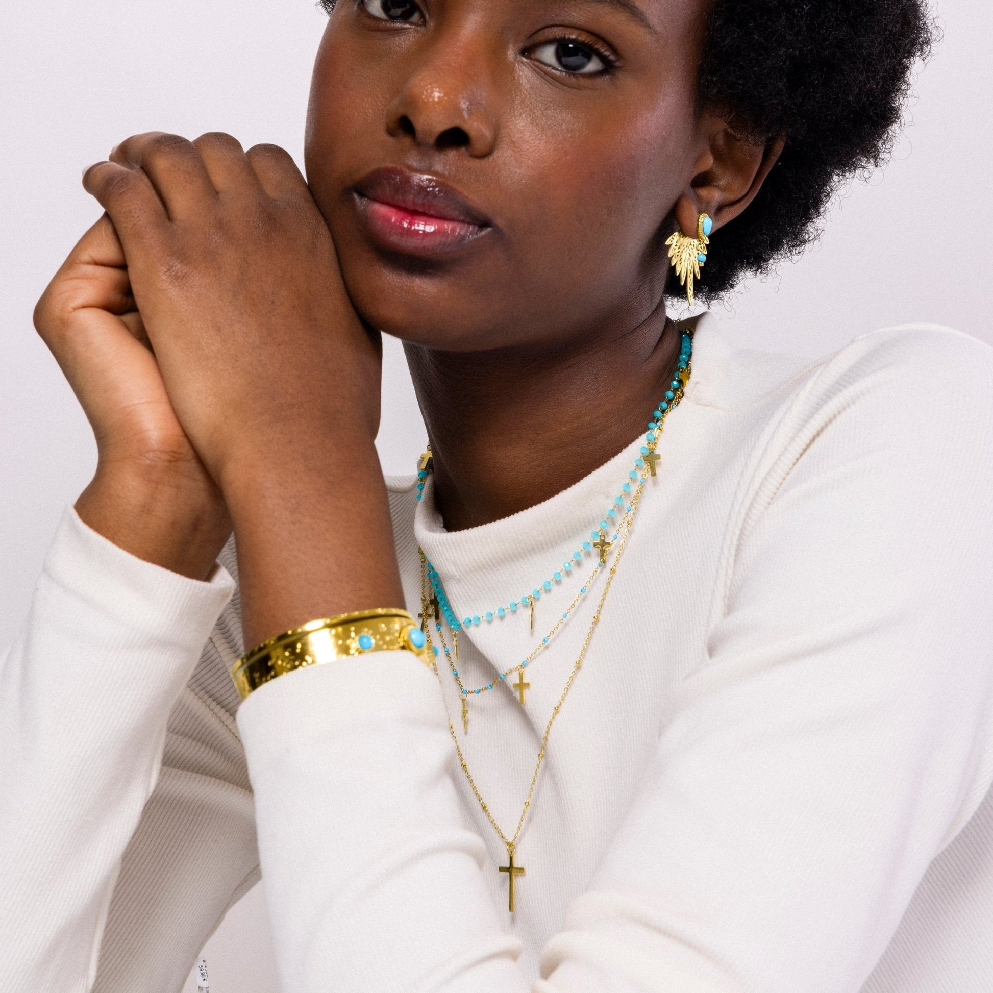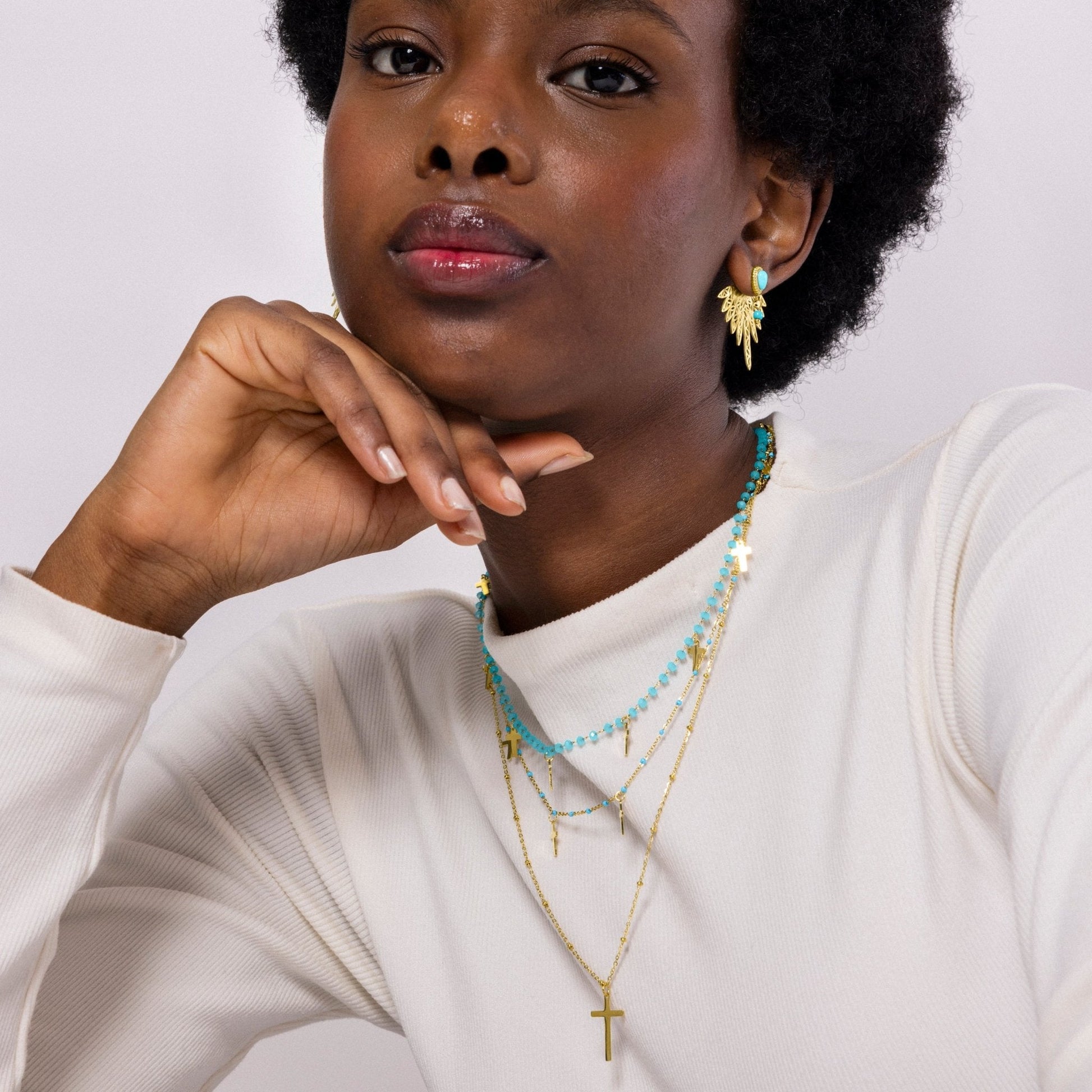 Collar de acero Lidriel de Cristal Azul acabado en oro amarillo de 18k. El estilo Boho es una estética de espíritu libre que mezcla diferentes culturas y expresiones artísticas en un estilo ecléctico con énfasis en los elementos orgánicos y la naturaleza.