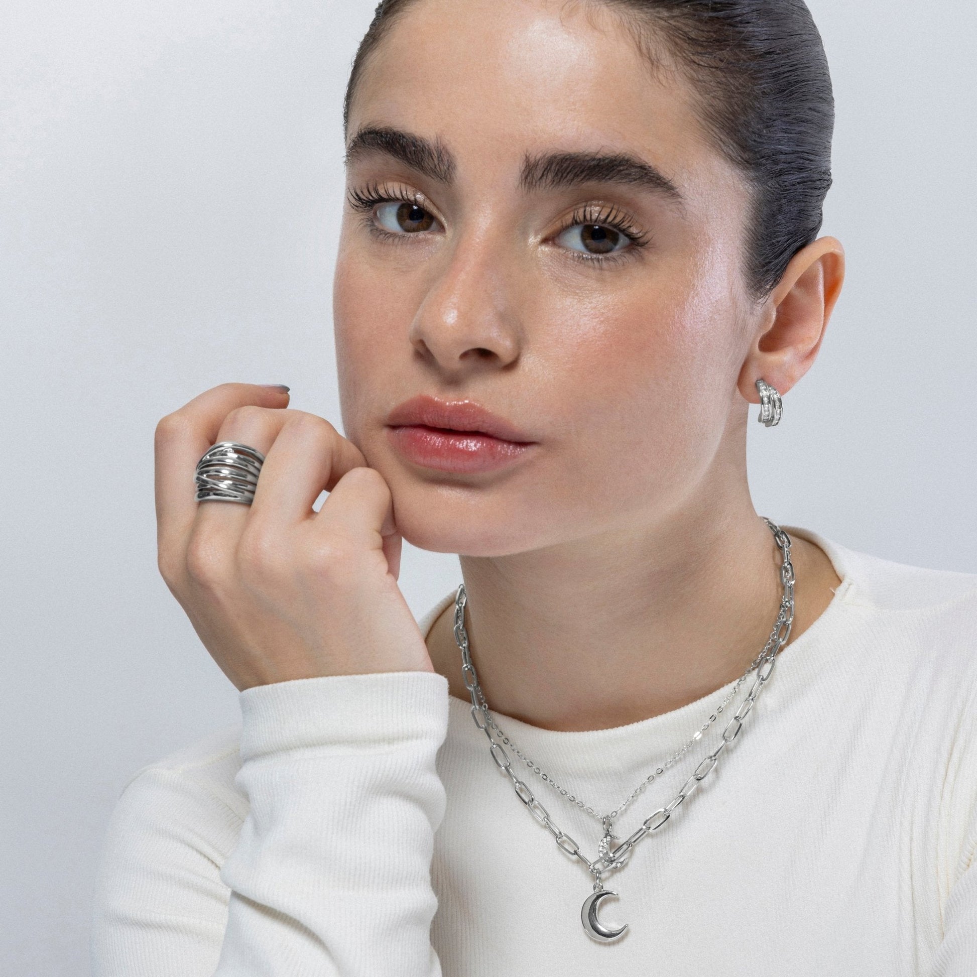 Collar Luna de Circonita Brillante acabado en baño de rodio. África Basic encarna la sencillez refinada, piezas atemporales con líneas suaves y el brillo adicional de las circonitas. Joyas básicas sin pretensiones que son perfectas para el uso diario, pero también pueden funcionar en ocasiones especiales.