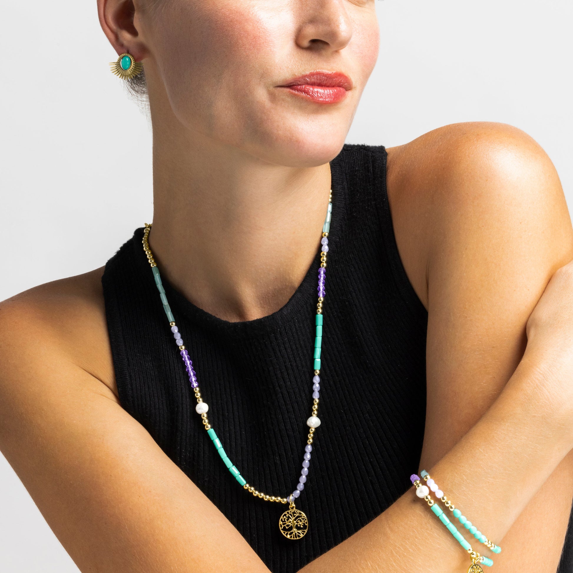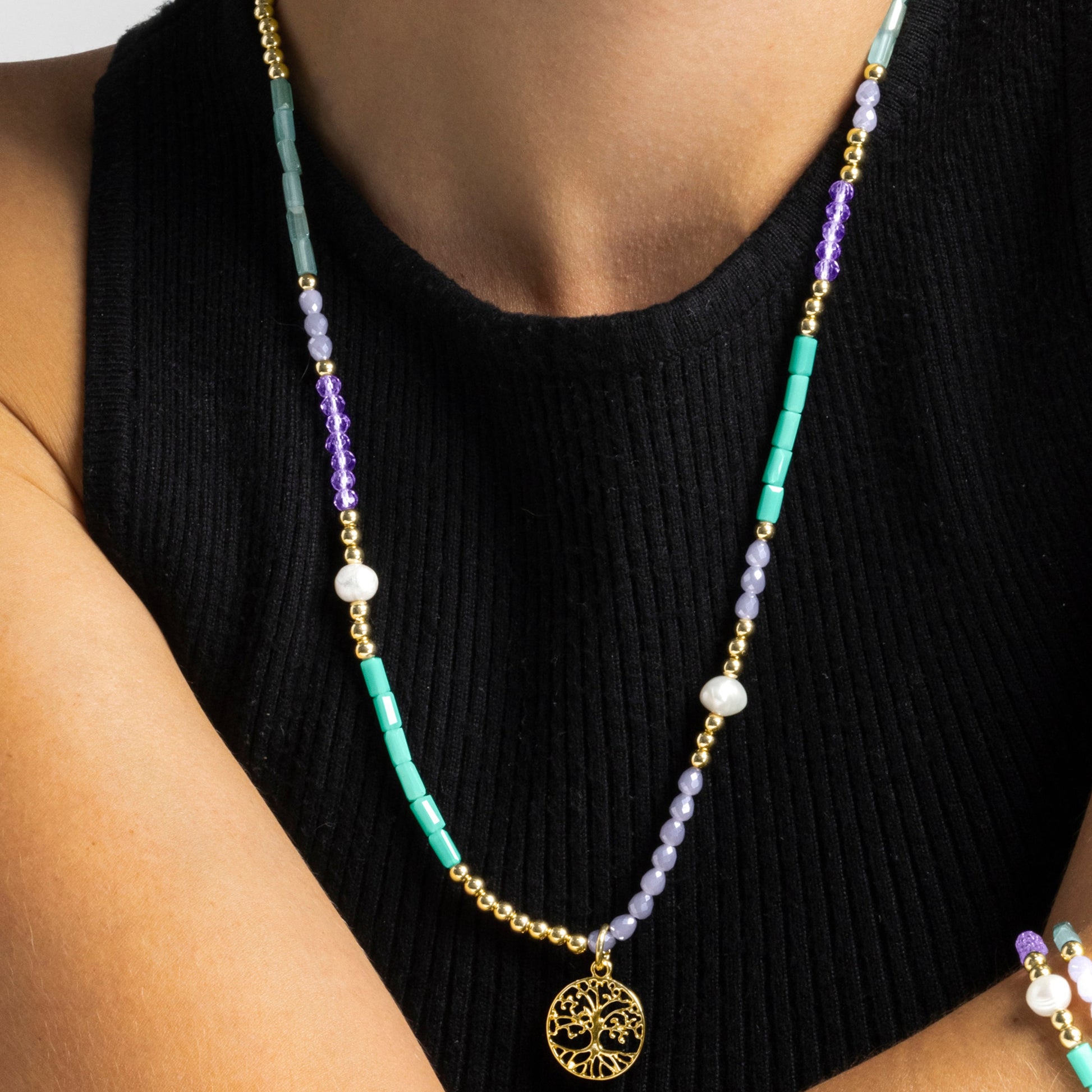 Collar de metal Zorsi con Cristal Azul acabado oro 18k. El estilo Boho es una estética de espíritu libre que mezcla diferentes culturas y expresiones artísticas en un estilo ecléctico con énfasis en los elementos orgánicos y la naturaleza.