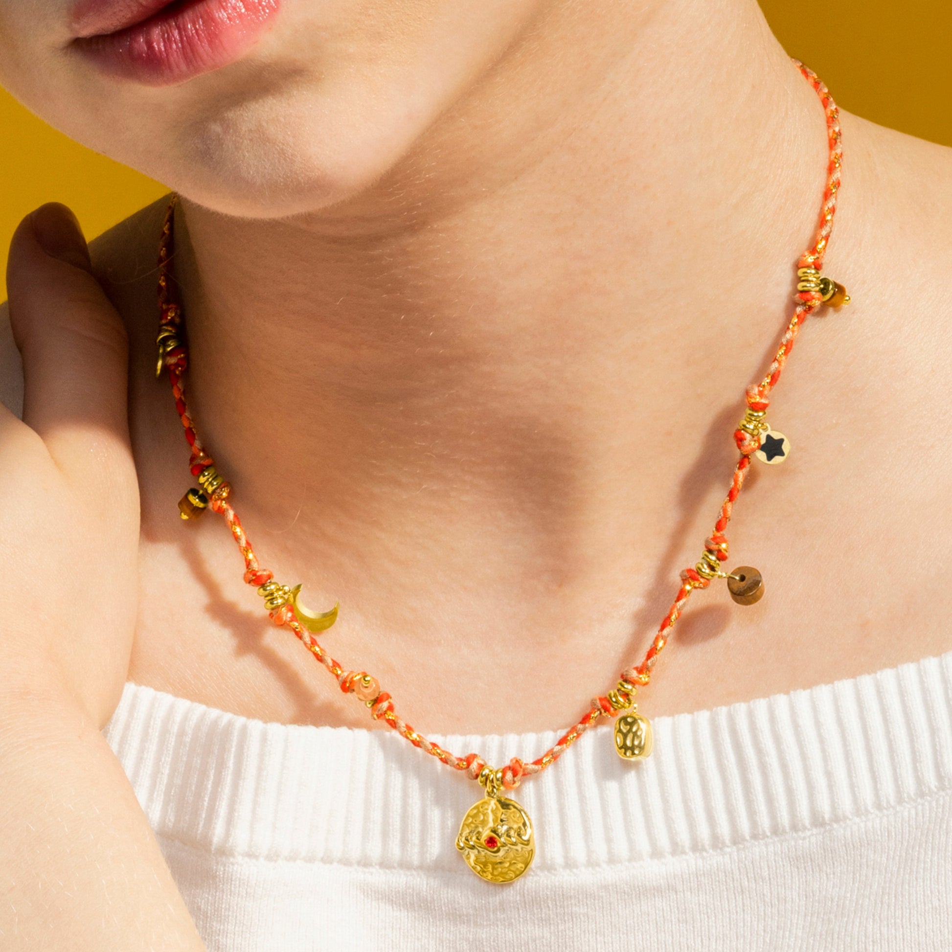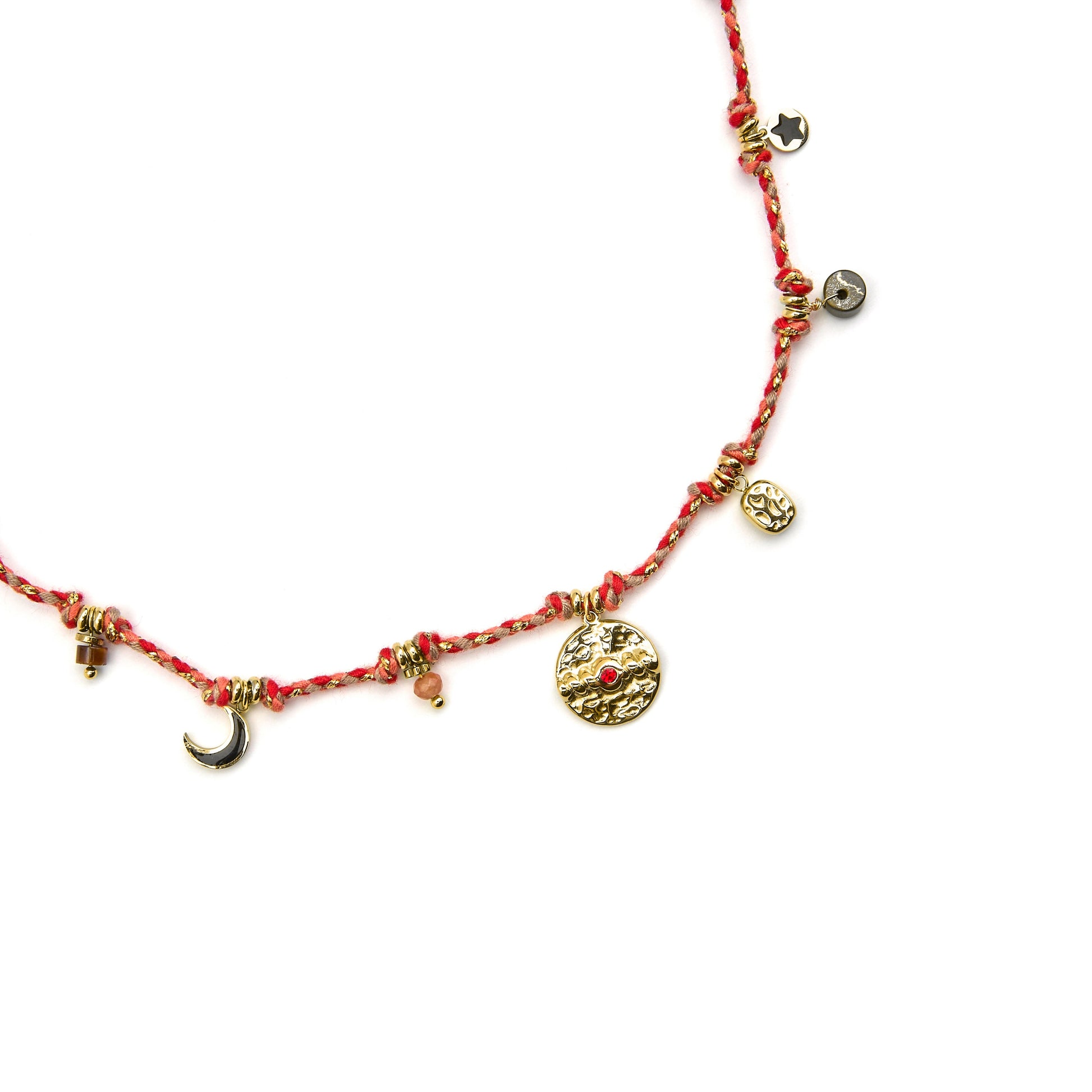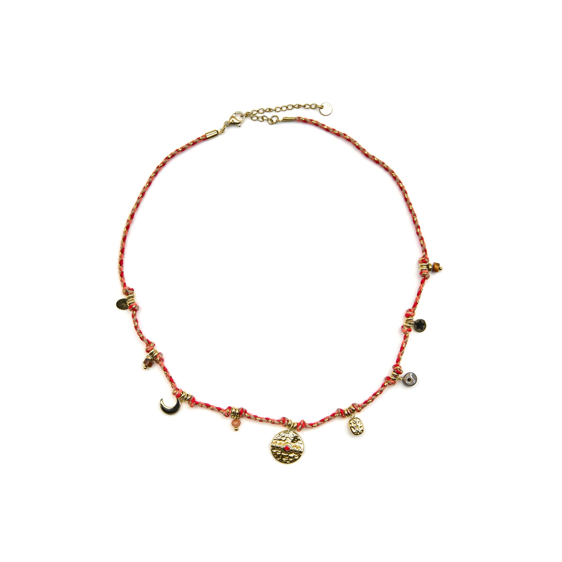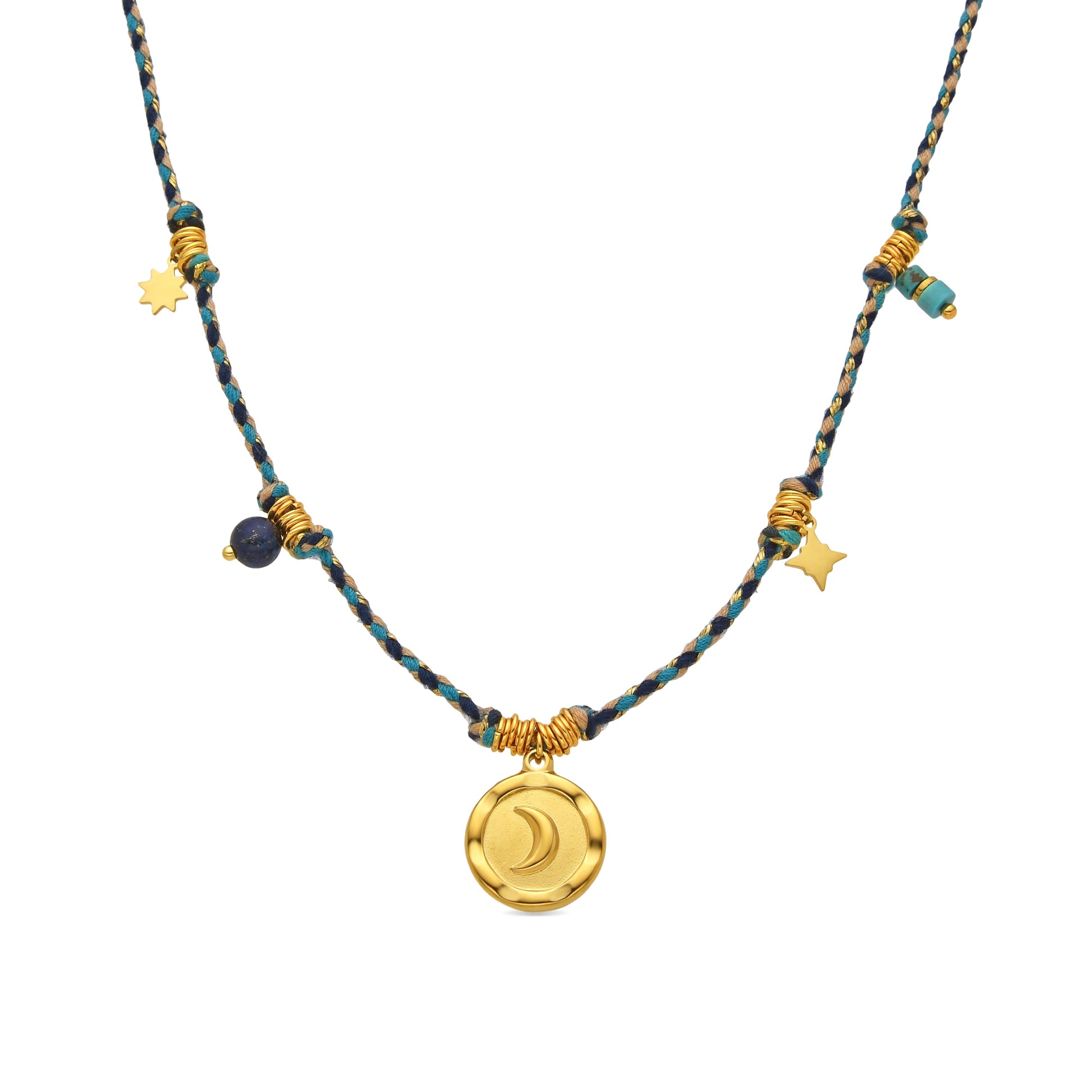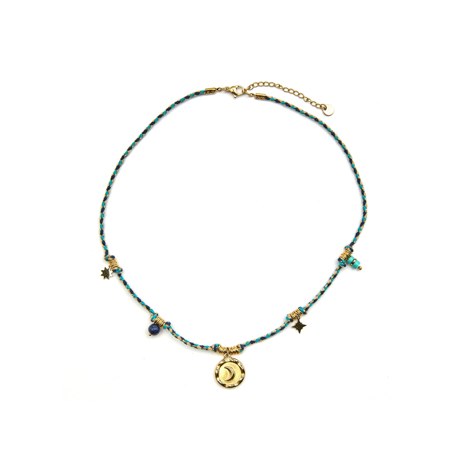 Collar de acero Liskel con Cristal Azul Oscuro acabado oro 18k. El estilo Boho es una estética de espíritu libre que mezcla diferentes culturas y expresiones artísticas en un estilo ecléctico con énfasis en los elementos orgánicos y la naturaleza.