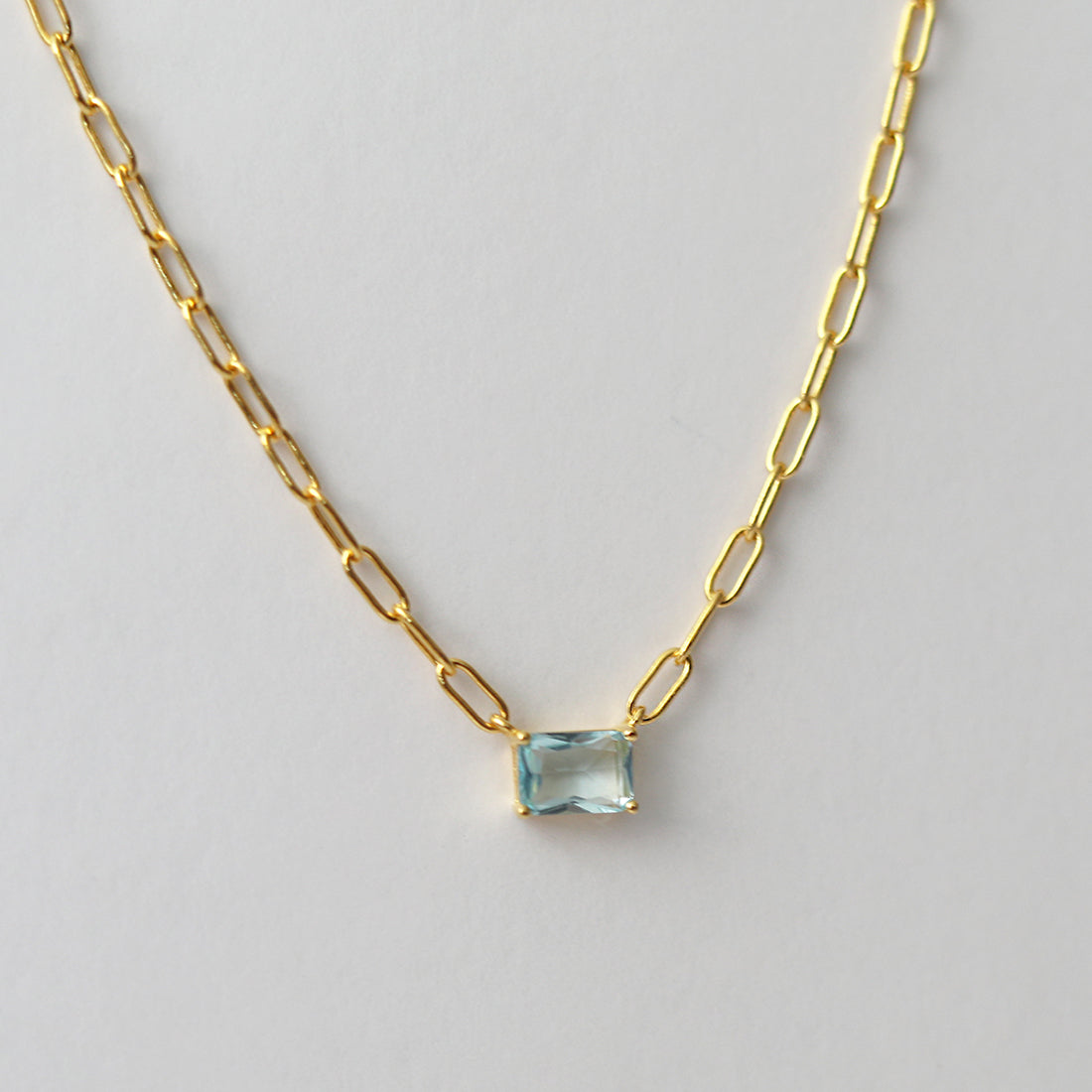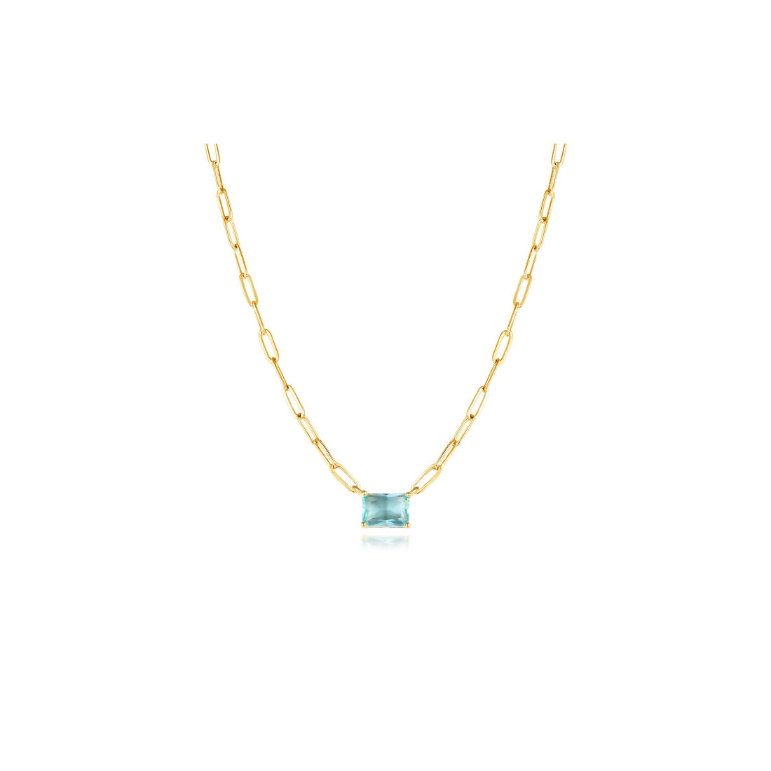 La circonita central en talla baguette en tonalidad azul agua marina simboliza su amor por la naturaleza y el mar, tan presente en el lugar donde vivio. La cadena de eslabones refleja su fuerte conexión con su familia y amigos, siempre presente en su vida.