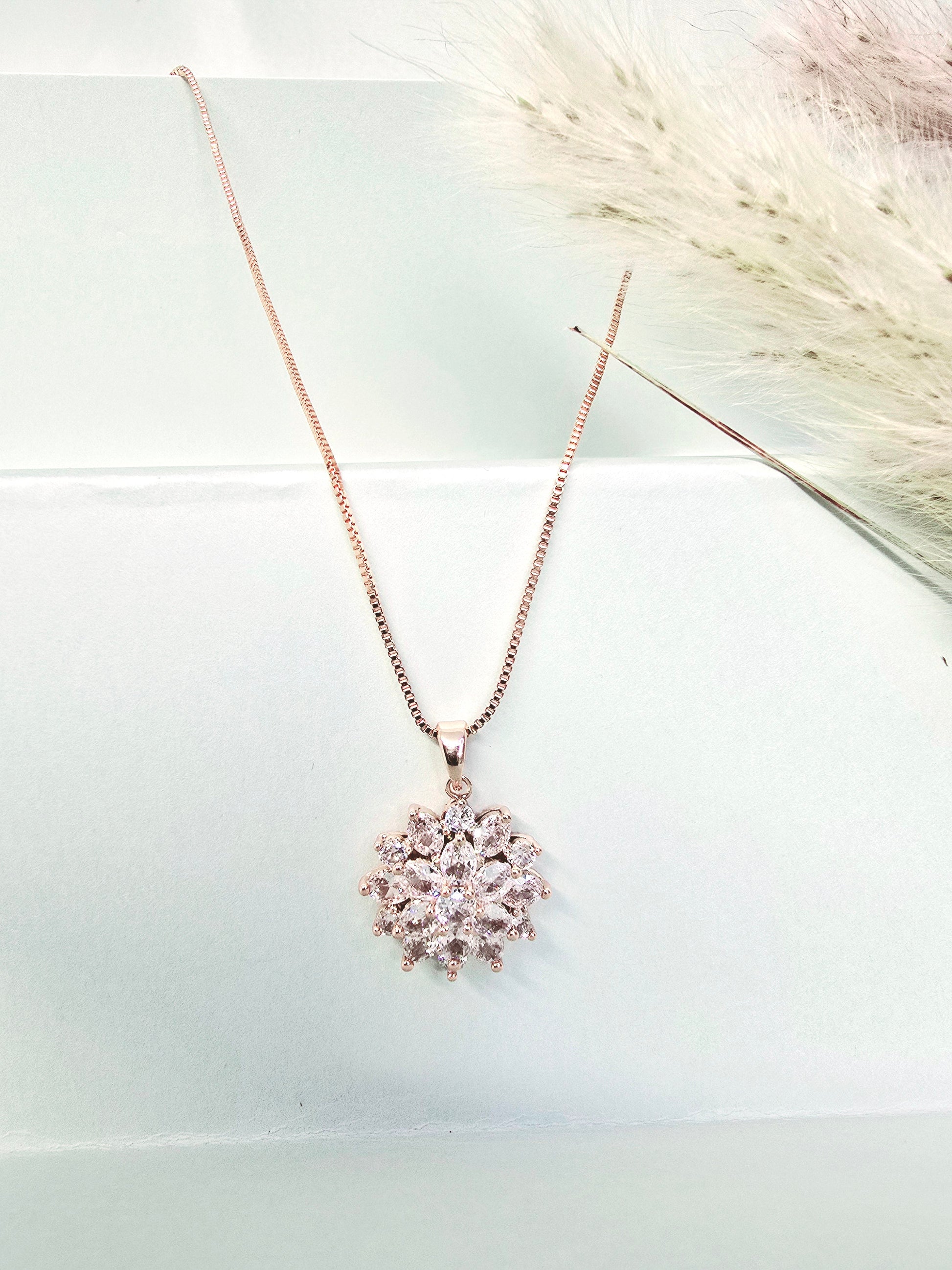A delicate set inspired by the timeless beauty of sunlit petals. The Gardenia ensemble features a necklace and matching earrings crafted in a sunflower motif, adorned with sparkling zirconia stones and a refined rose gold finish. A statement of romance and feminine elegance.