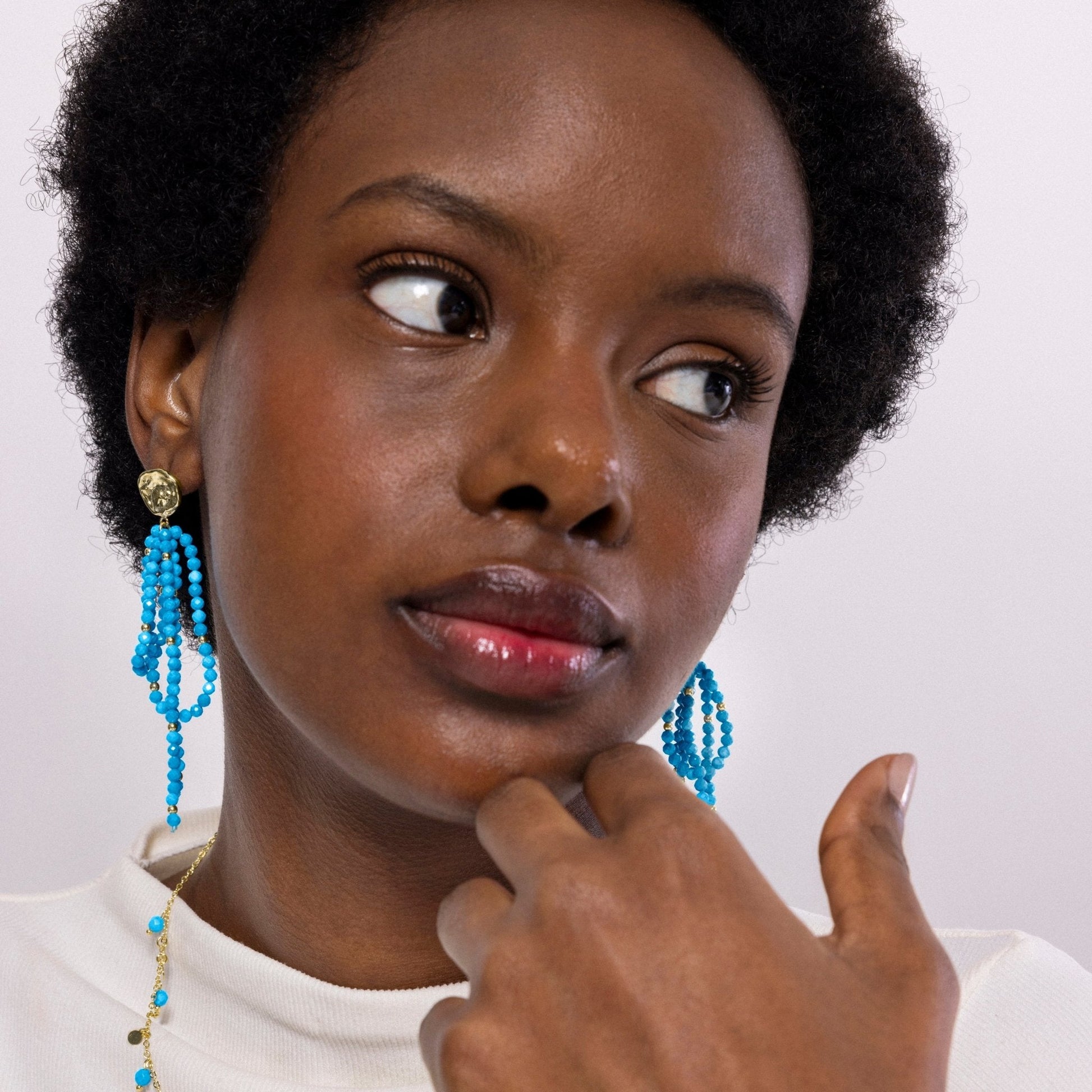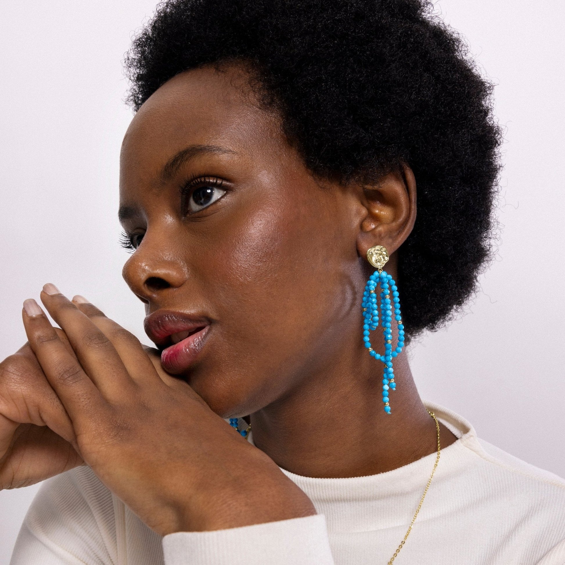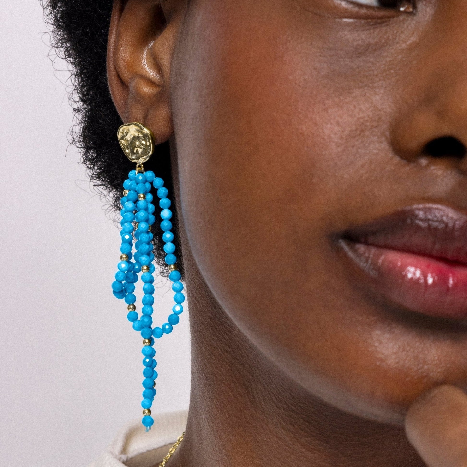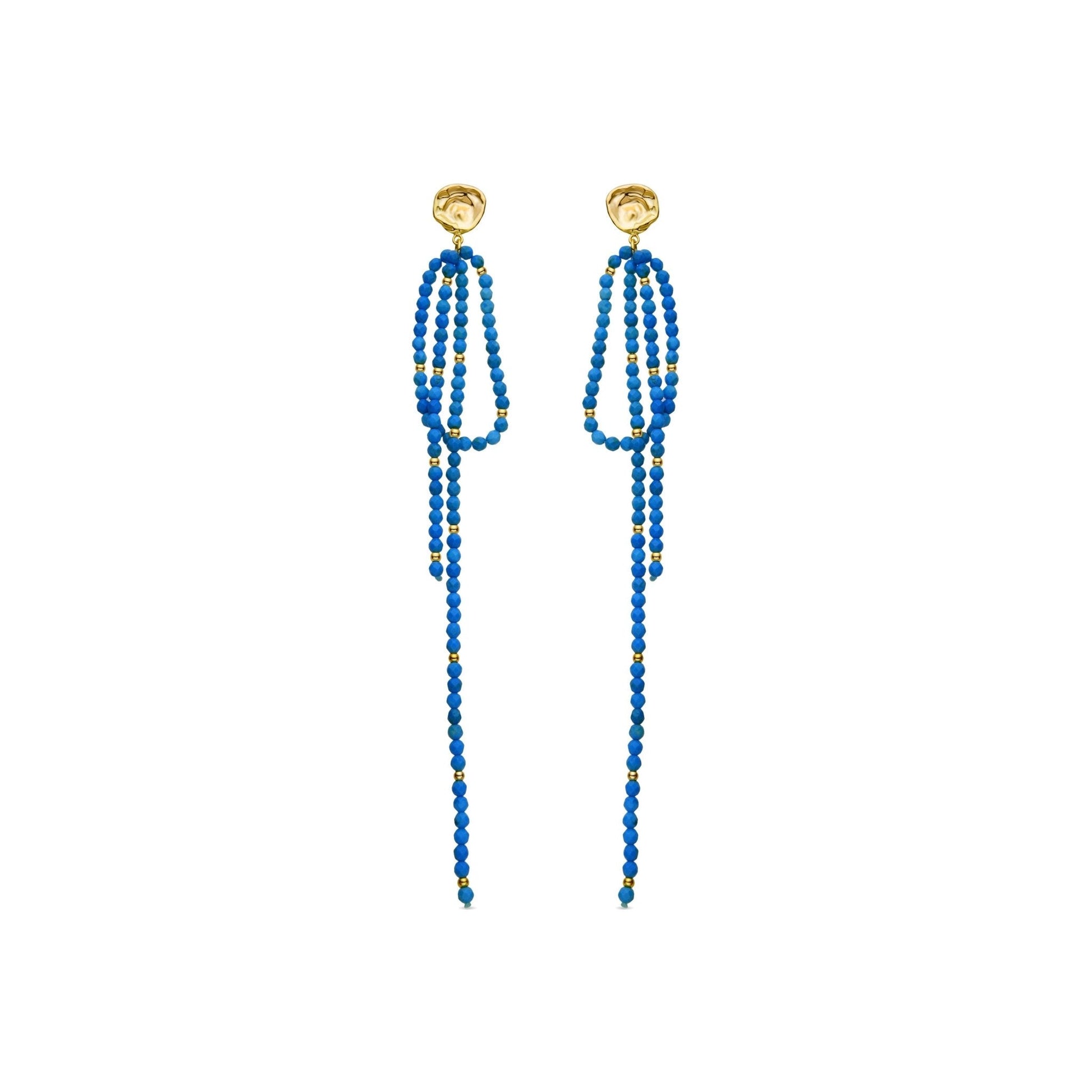 Pendientes de metal Fawya de Turquesa acabado en oro amarillo de 18k. El estilo Boho es una estética de espíritu libre que mezcla diferentes culturas y expresiones artísticas en un estilo ecléctico con énfasis en los elementos orgánicos y la naturaleza.