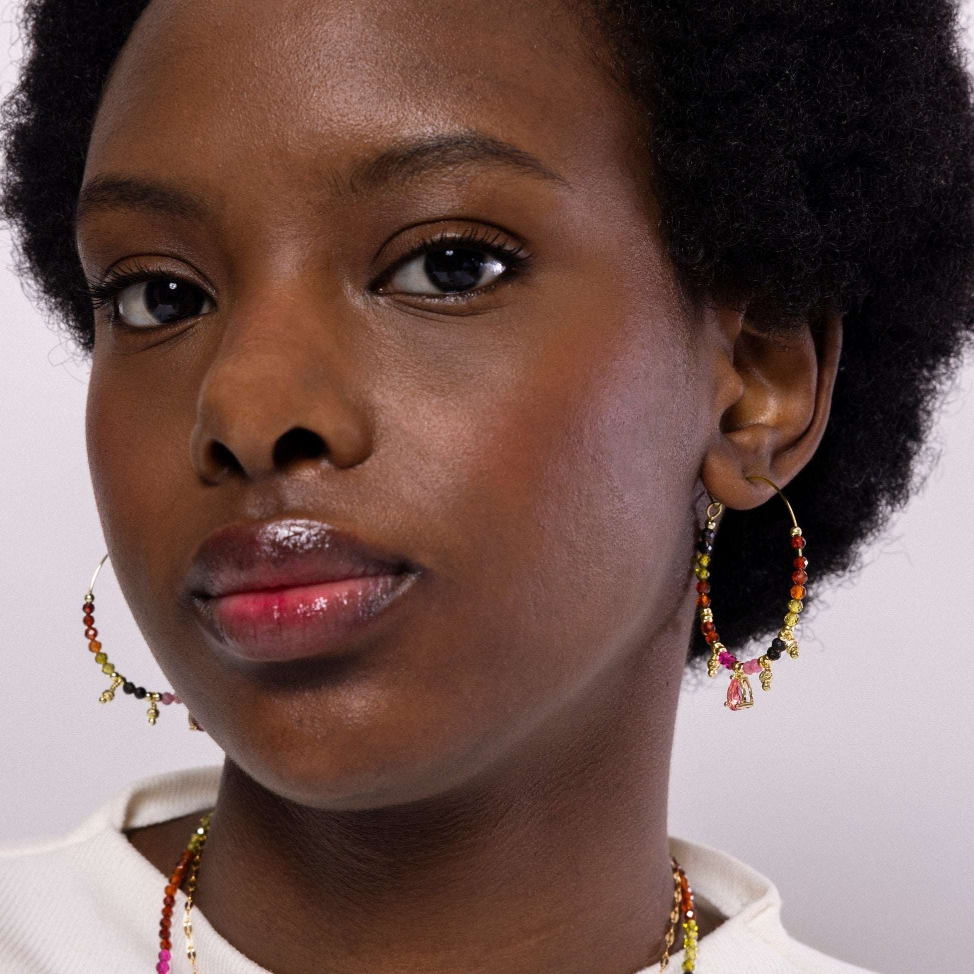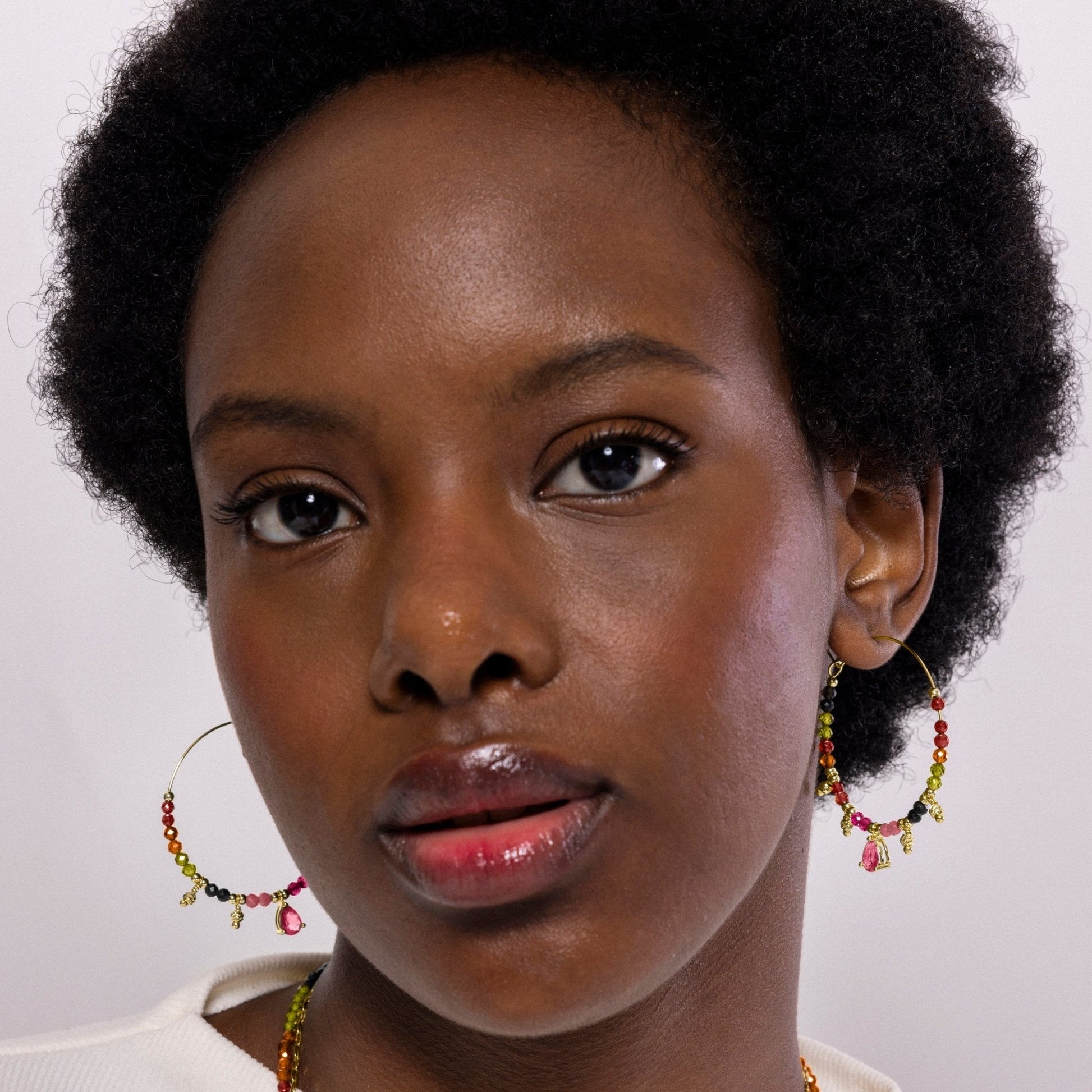 Pendientes de metal Baim de Turmalina Multicolor acabado en oro amarillo de 18k. El estilo Boho es una estética de espíritu libre que mezcla diferentes culturas y expresiones artísticas en un estilo ecléctico con énfasis en los elementos orgánicos y la naturaleza.