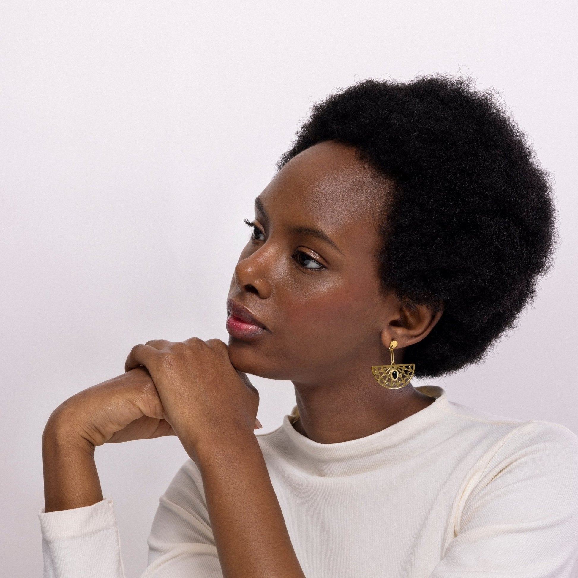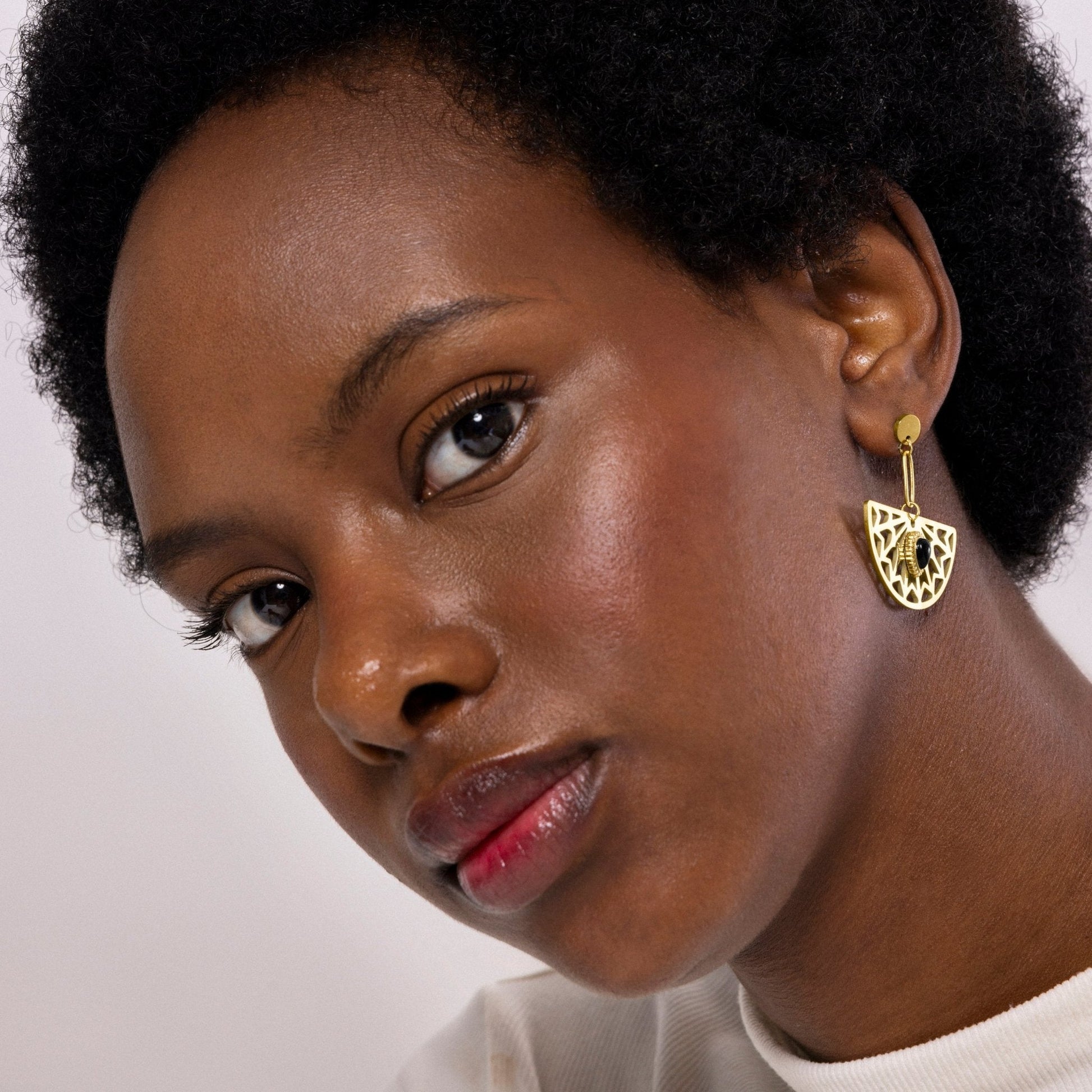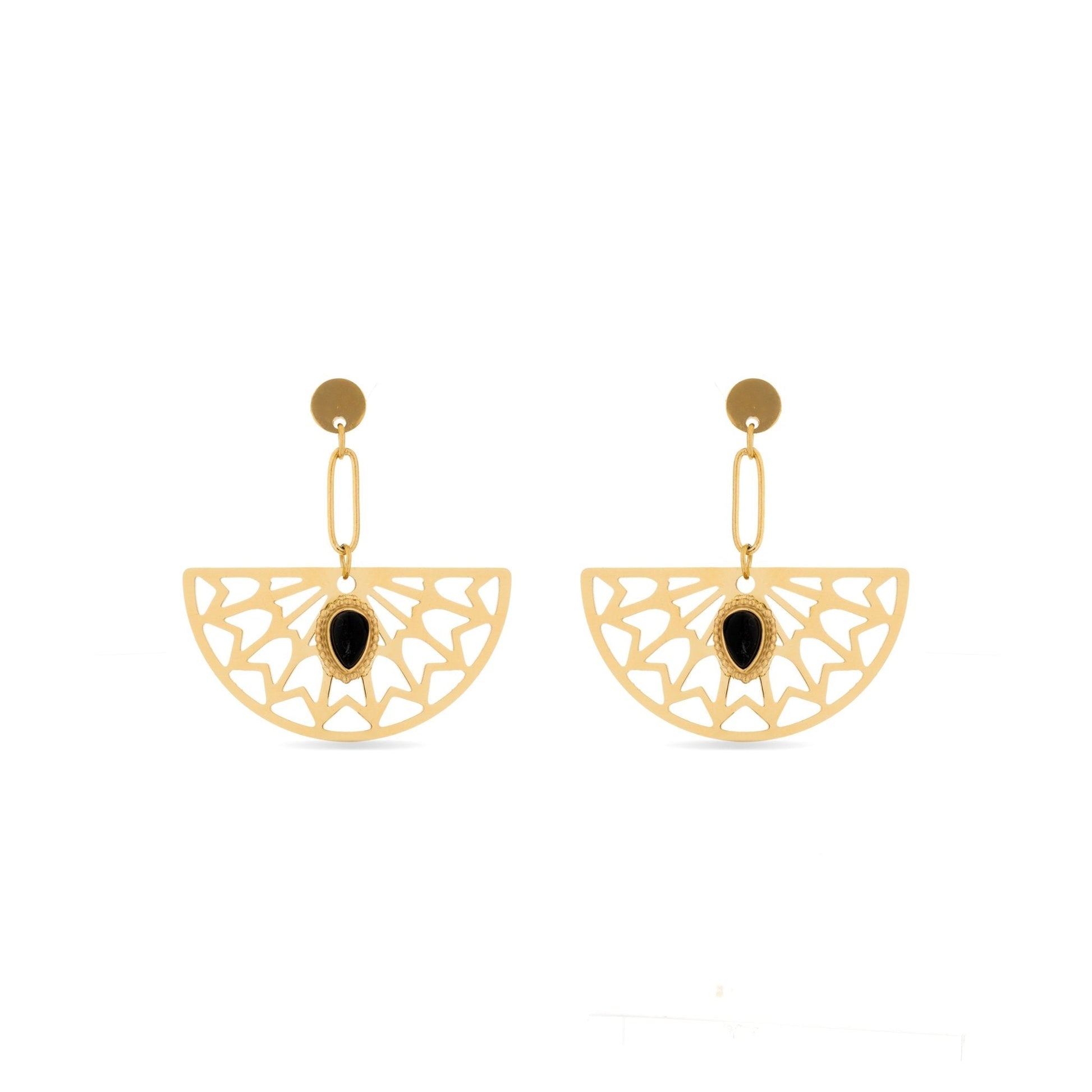 Pendientes de acero Tawa de Onix acabados en oro amarillo de 18K. El estilo Boho es una estética de espíritu libre que mezcla diferentes culturas y expresiones artísticas en un estilo ecléctico con énfasis en los elementos orgánicos y la naturaleza.