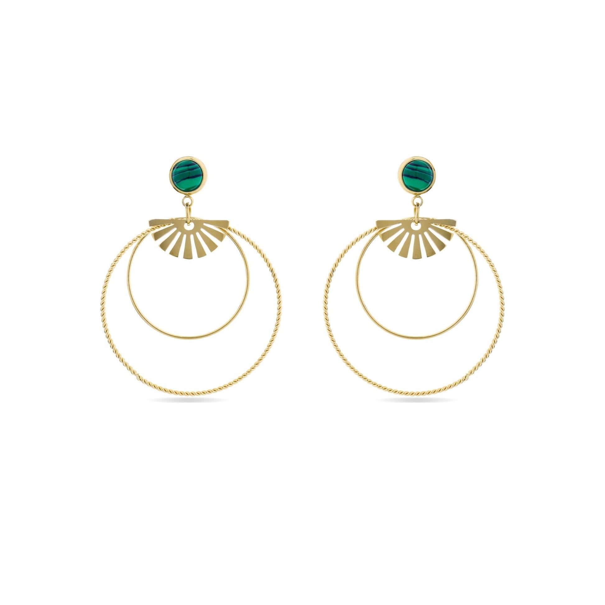 Pendientes de acero Mobu de Malaquita acabados en oro amarillo de 18K. África se convierte en la línea perfecta para mujeres con personalidad, que no temen arriesgar y lucir piezas con carácter propio.