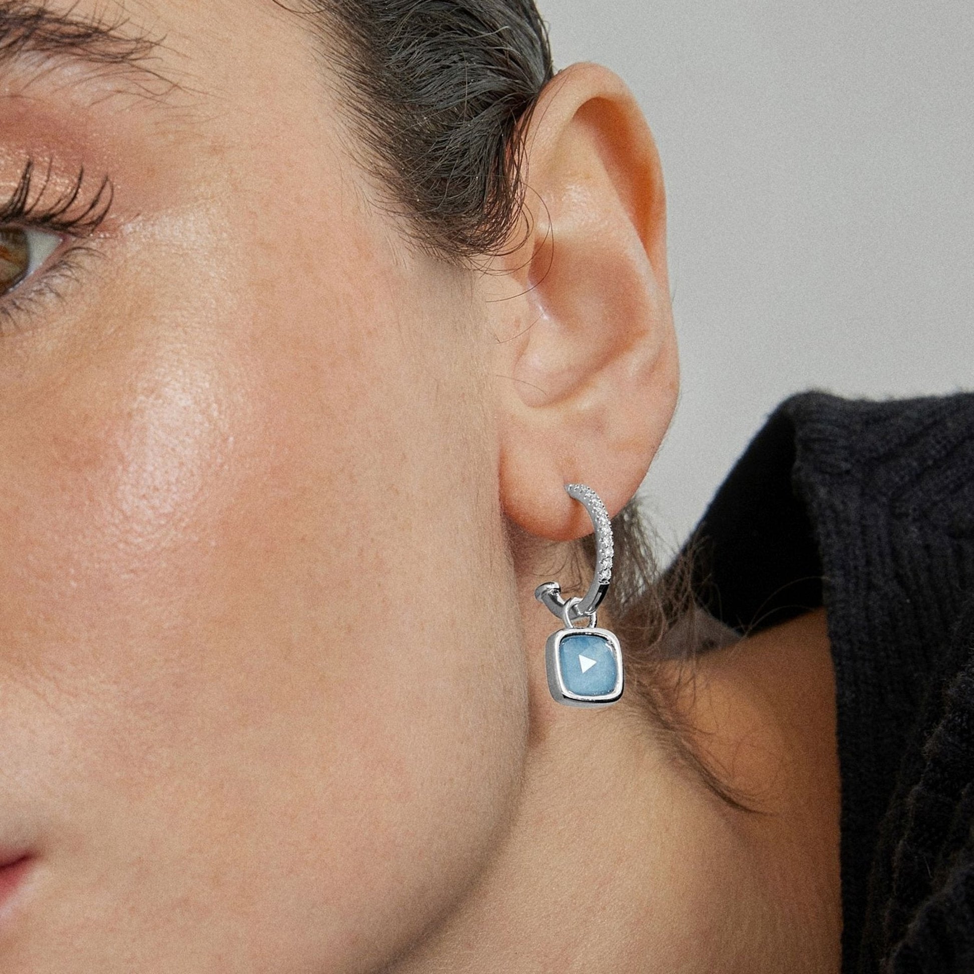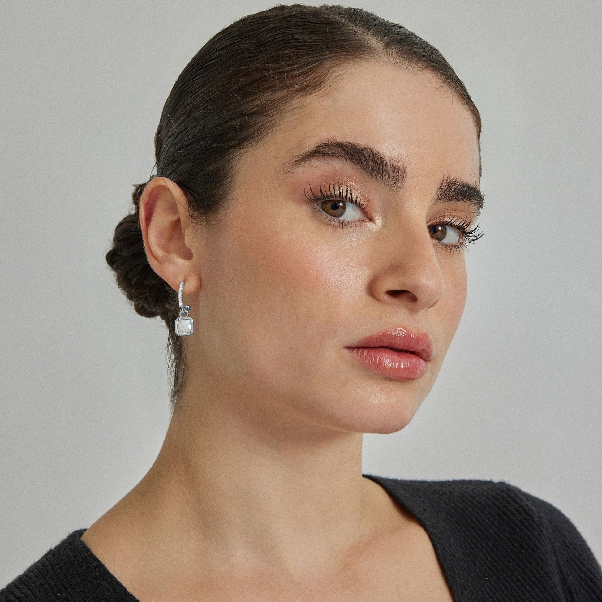 Pendientes Khan acabado plata con cristal blanco acabado rodio. África Basic encarna la sencillez refinada, piezas atemporales con líneas suaves y el brillo adicional de las circonitas. Joyas básicas sin pretensiones que son perfectas para el uso diario, pero también pueden funcionar en ocasiones especiales.