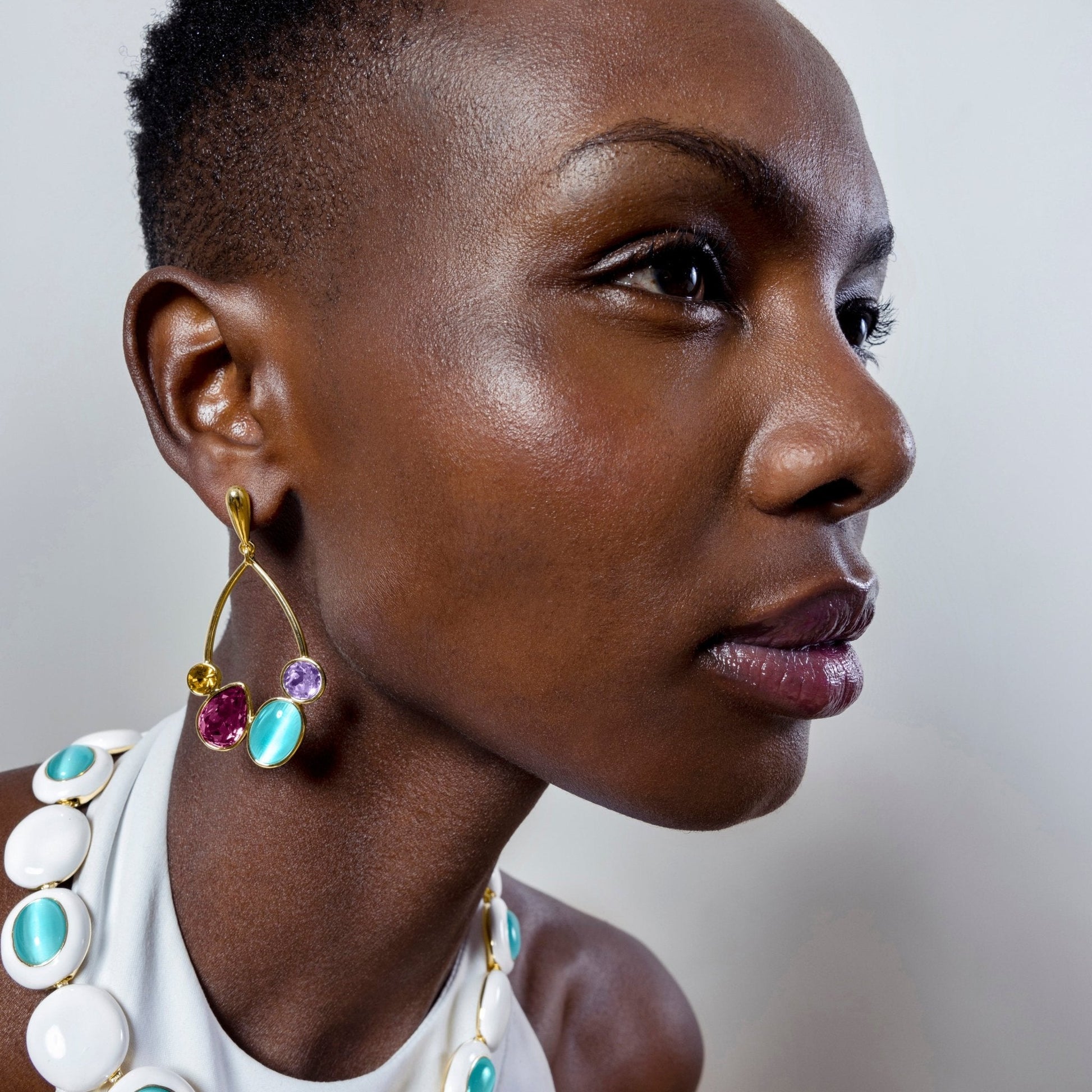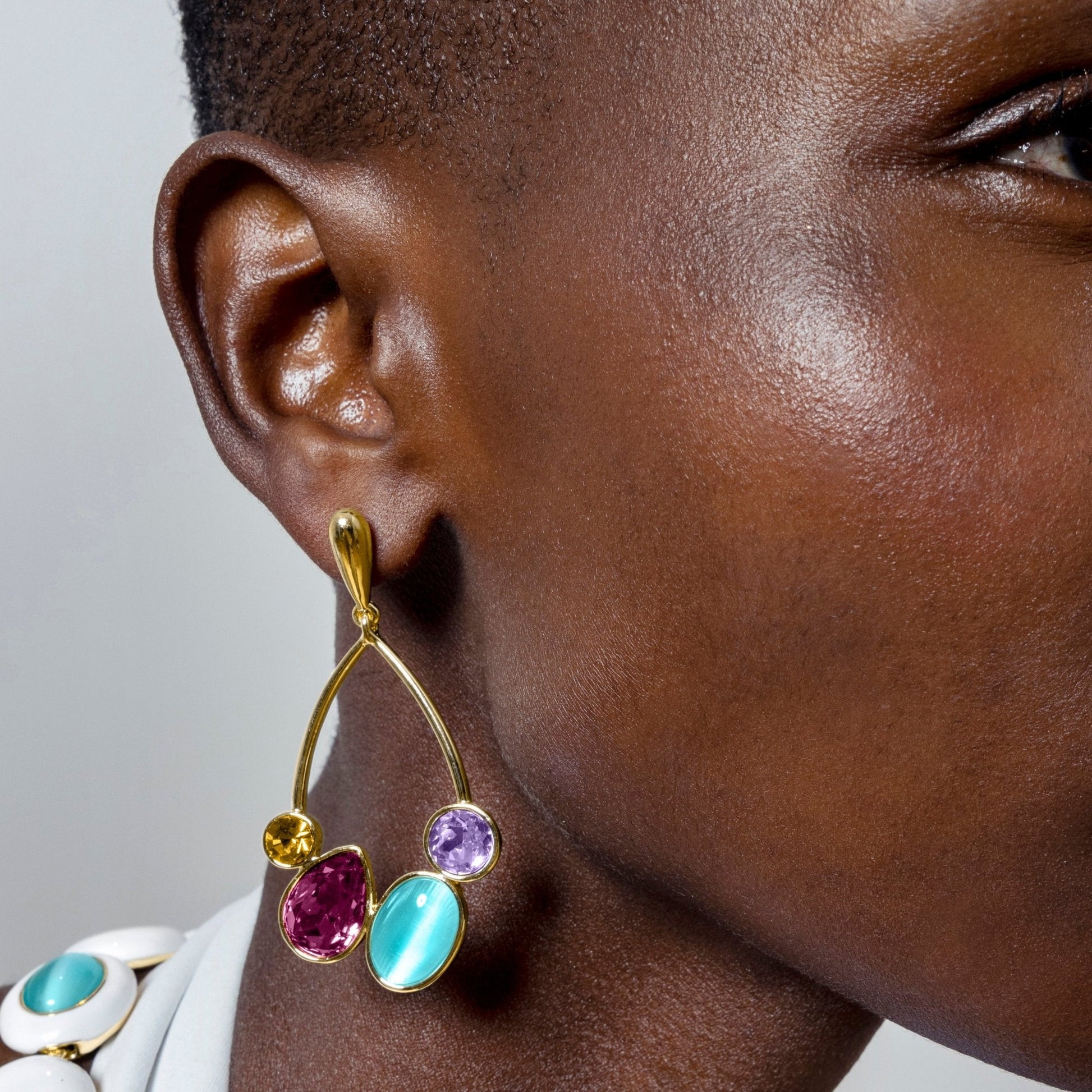 Pendientes Mortha de Circonita Multicolor acabados en oro amarillo de 18k. África se convierte en la línea perfecta para mujeres con personalidad, que no temen arriesgar y lucir piezas con carácter propio.