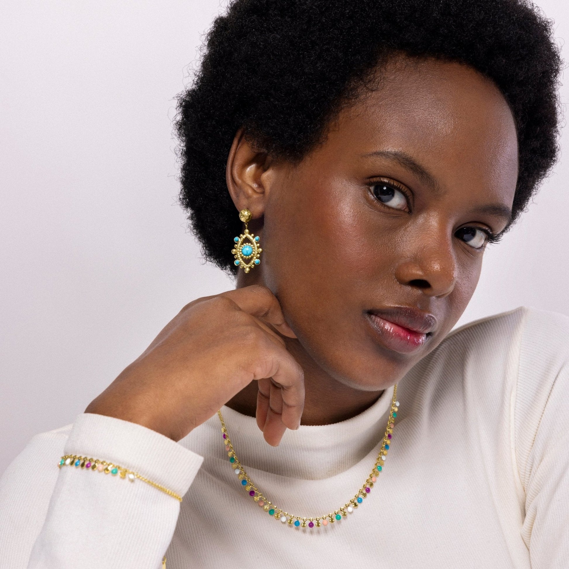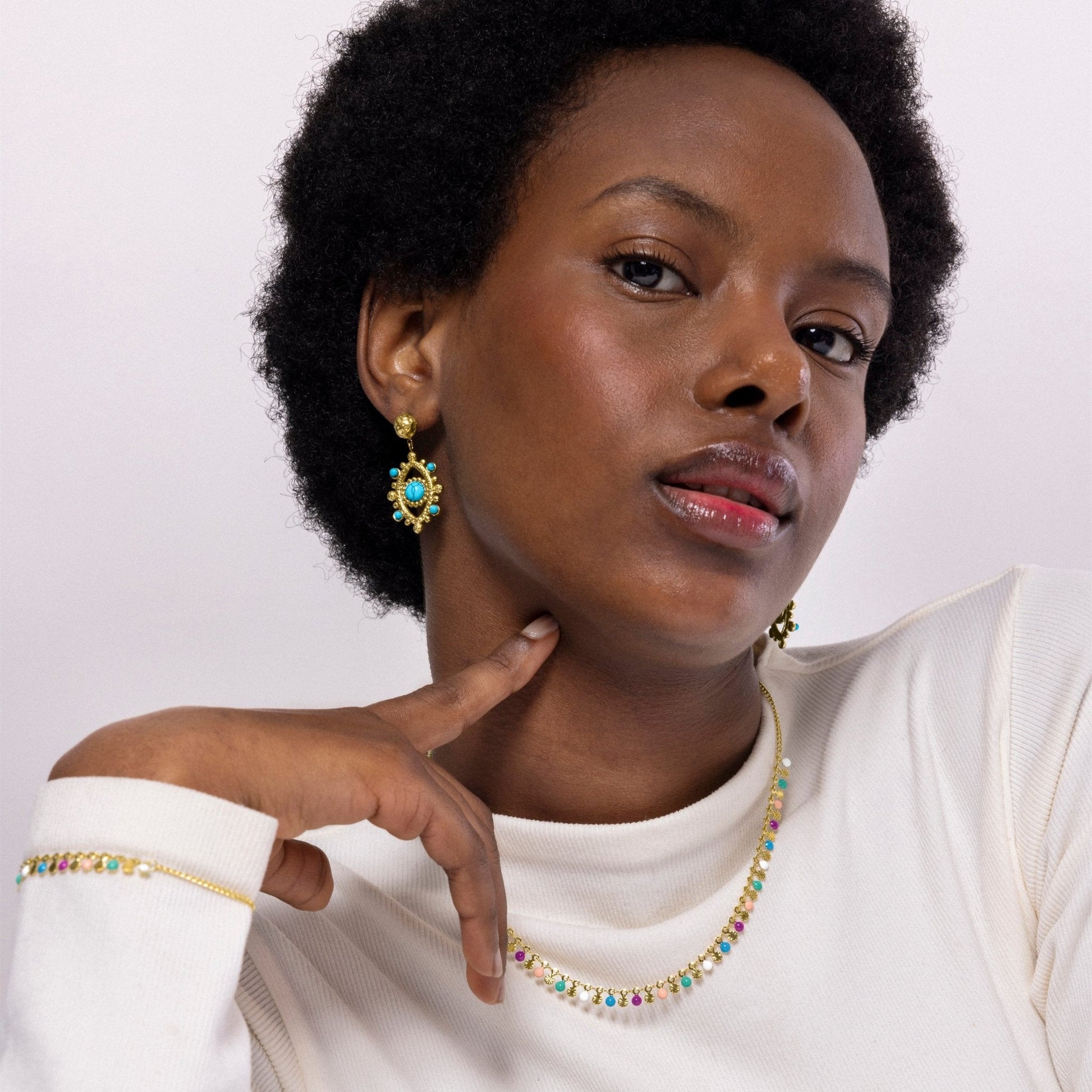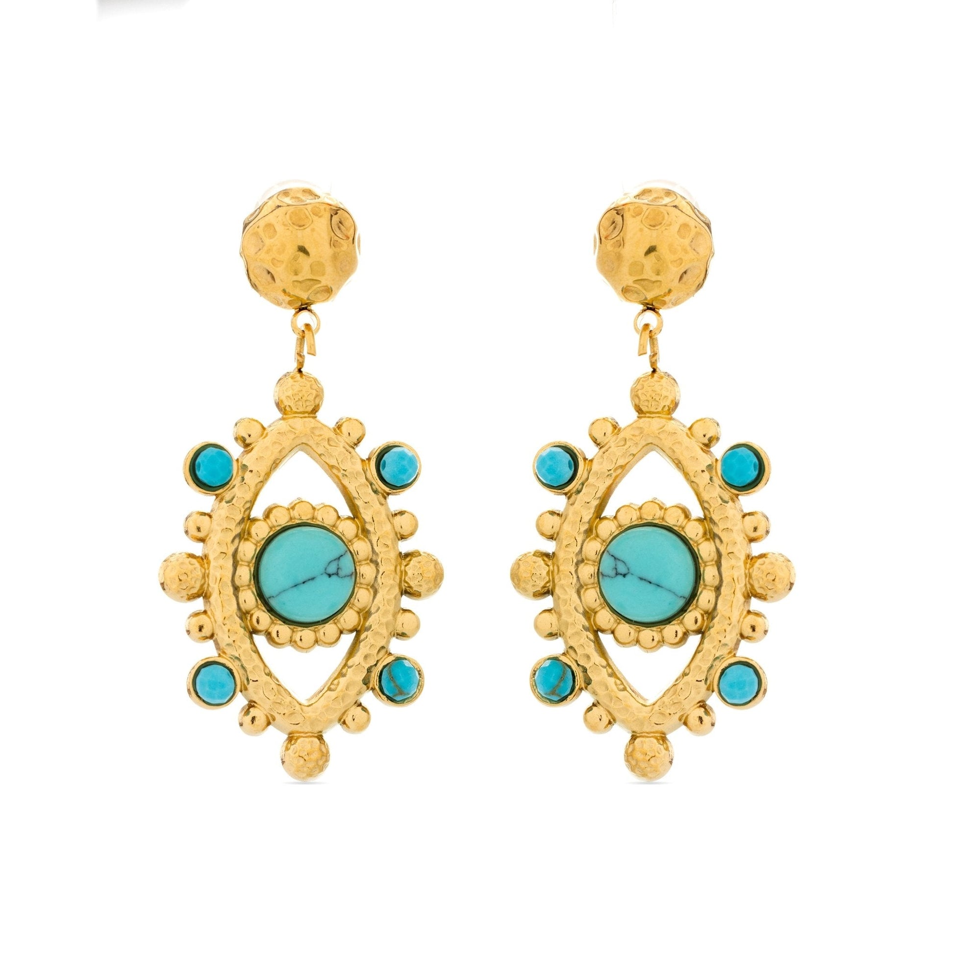 Pendientes de acero Romde de Turquesa acabados en oro amarillo de 18k. El estilo Boho es una estética de espíritu libre que mezcla diferentes culturas y expresiones artísticas en un estilo ecléctico con énfasis en los elementos orgánicos y la naturaleza.
