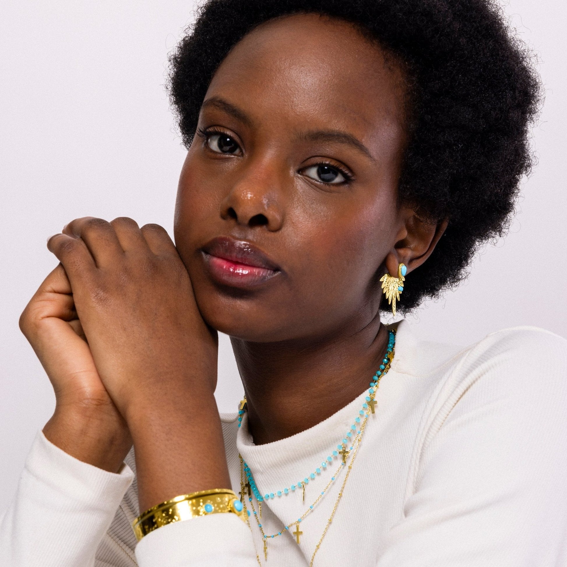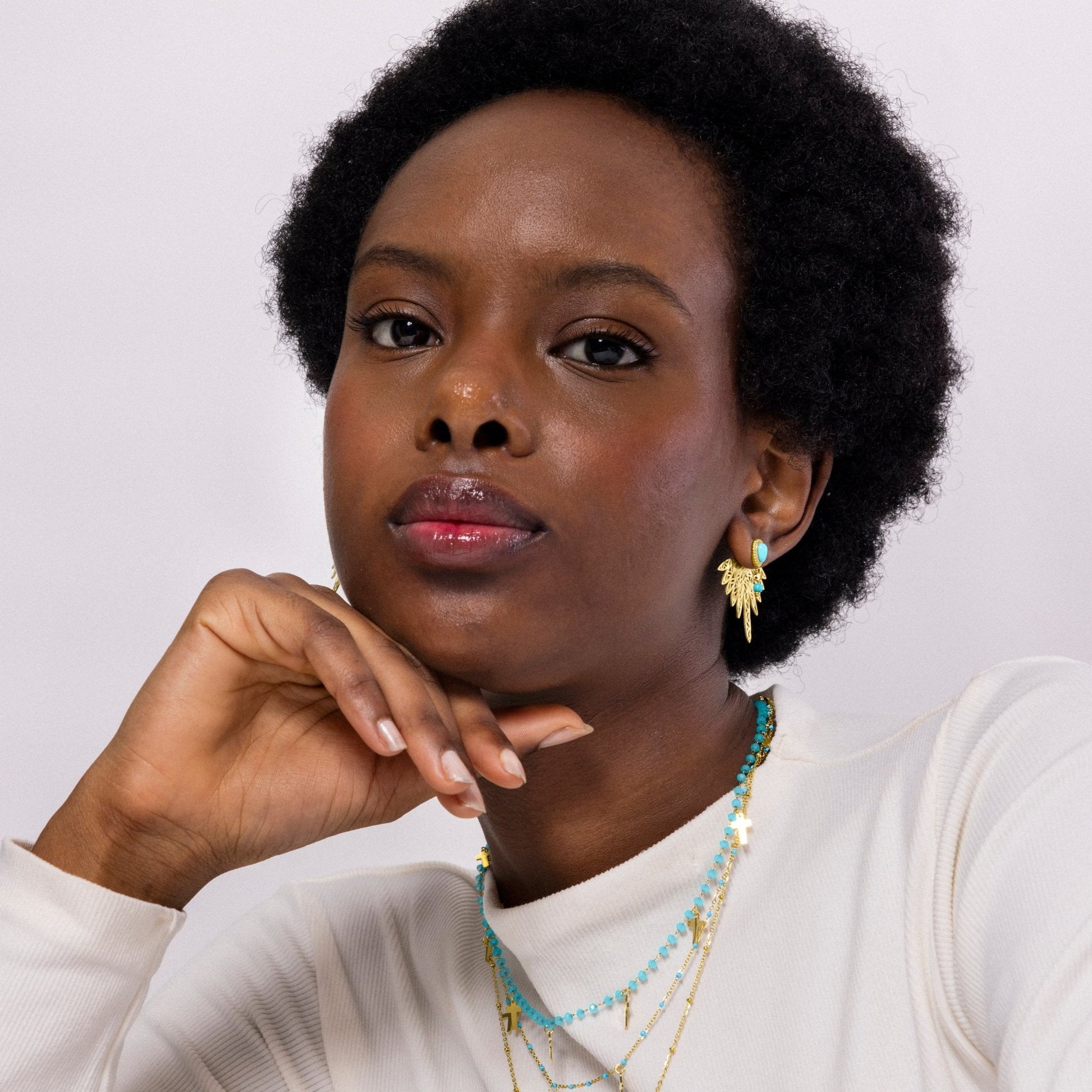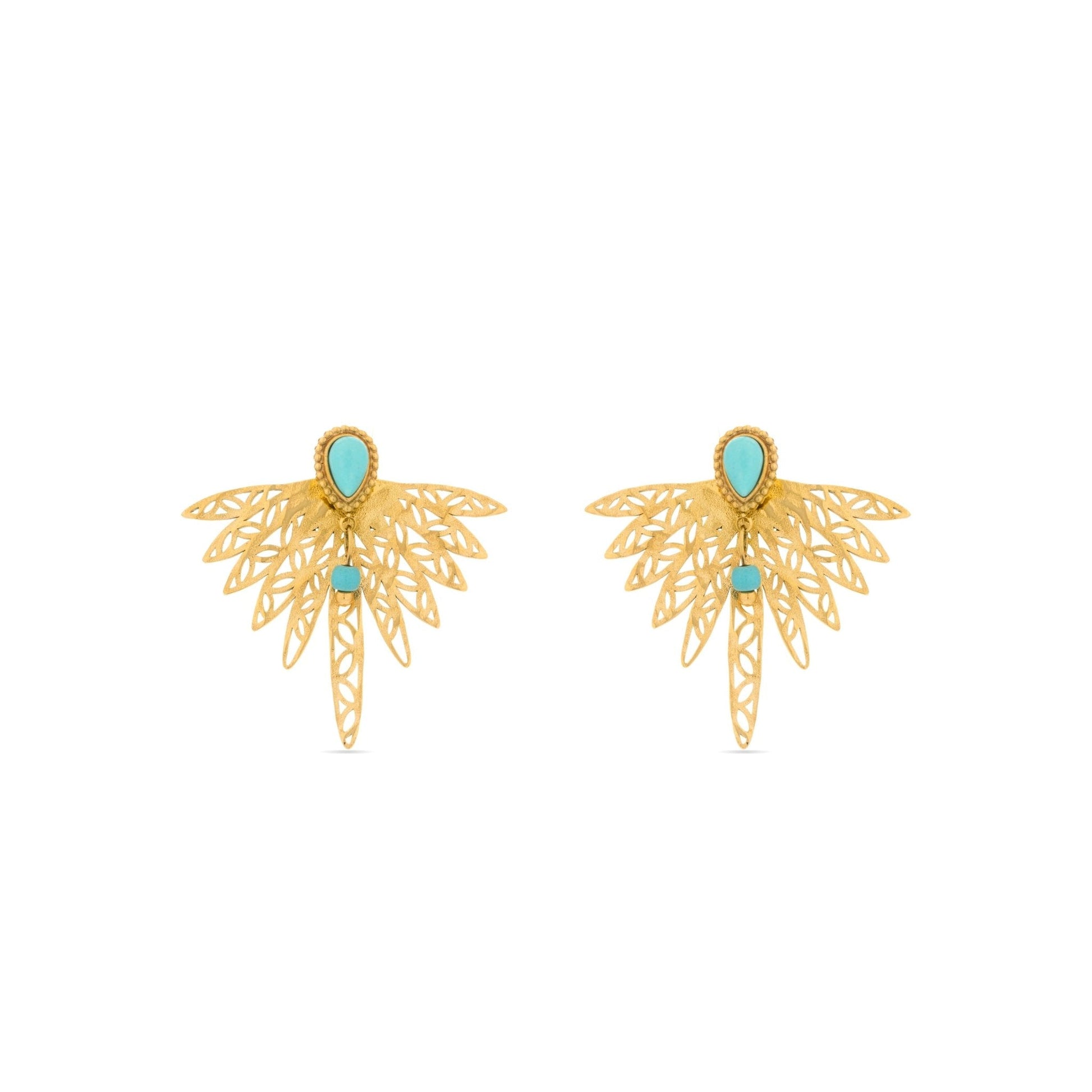 Pendientes de acero Resiah de Turquesa acabados en oro amarillo de 18k. El estilo Boho es una estética de espíritu libre que mezcla diferentes culturas y expresiones artísticas en un estilo ecléctico con énfasis en los elementos orgánicos y la naturaleza.