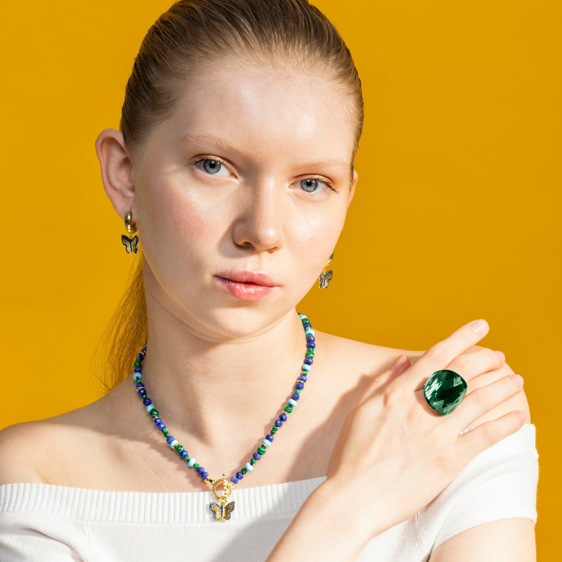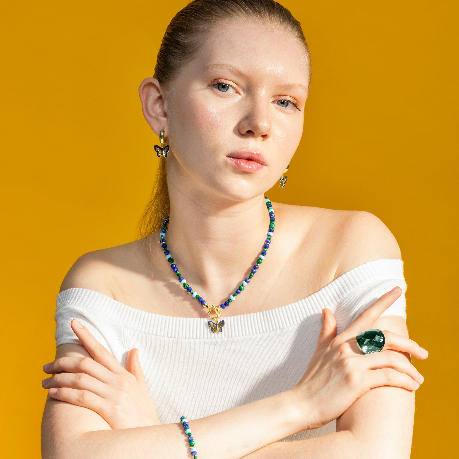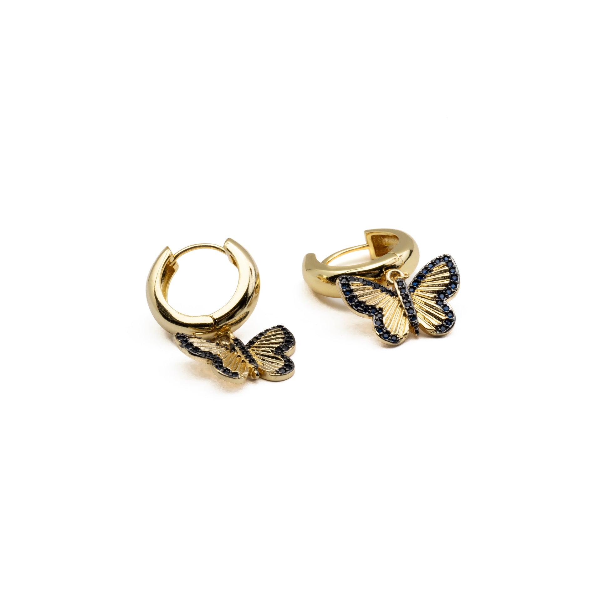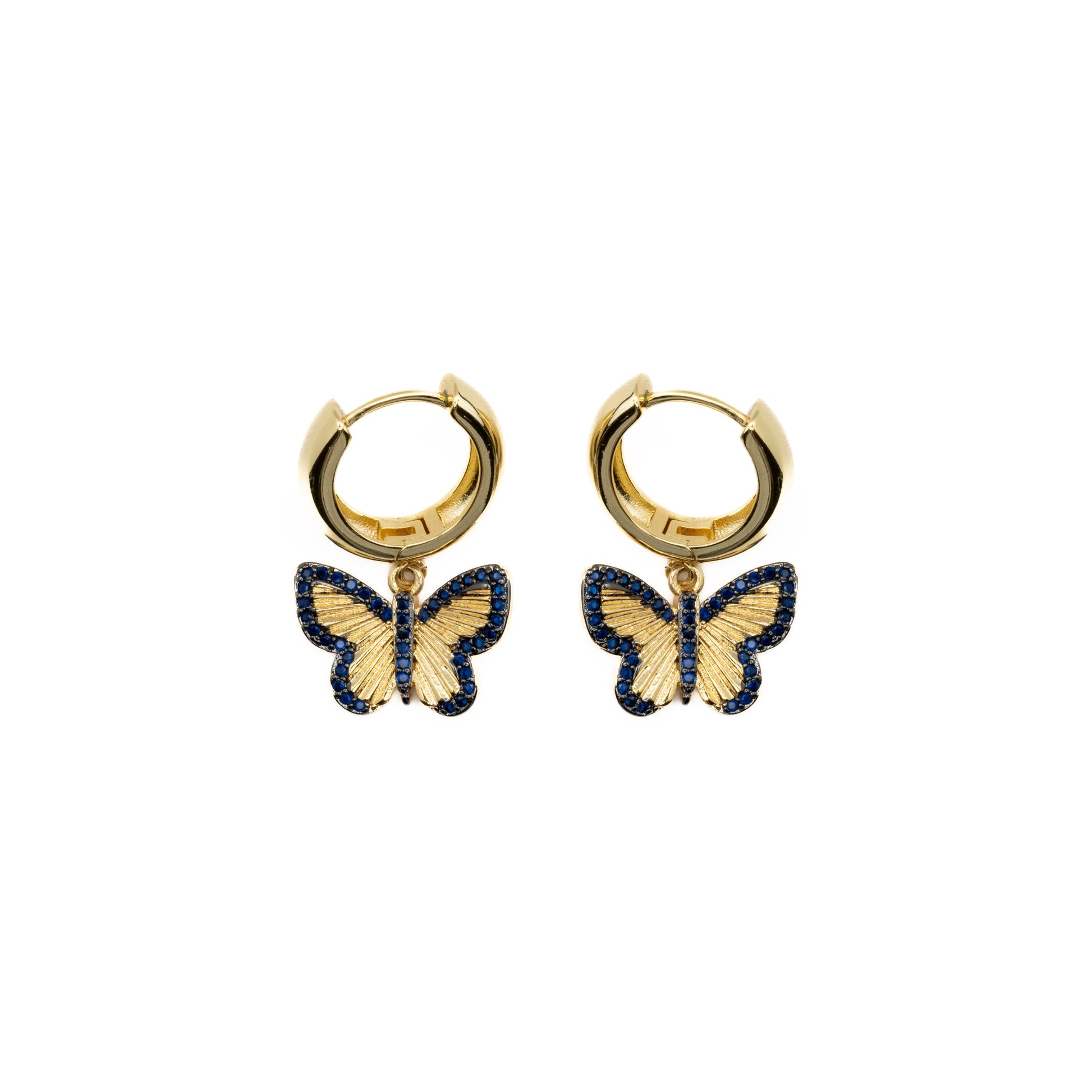 Pendientes de metal Arru con Circonita Zafiro acabado oro 18k. El estilo Boho es una estética de espíritu libre que mezcla diferentes culturas y expresiones artísticas en un estilo ecléctico con énfasis en los elementos orgánicos y la naturaleza.