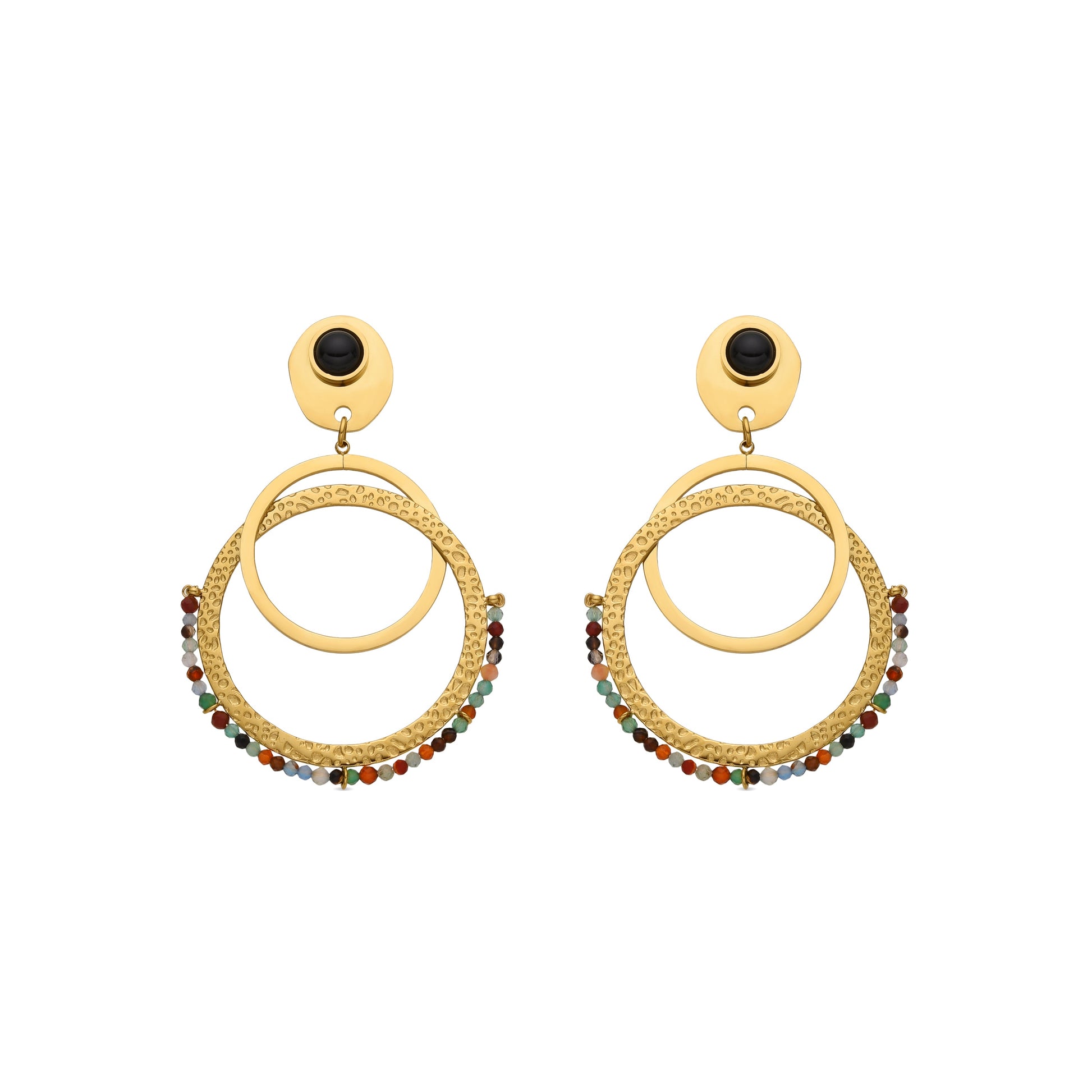 Pendientes de acero Kharaj con Cristal Multicolor acabado oro 18k. El estilo Boho es una estética de espíritu libre que mezcla diferentes culturas y expresiones artísticas en un estilo ecléctico con énfasis en los elementos orgánicos y la naturaleza.