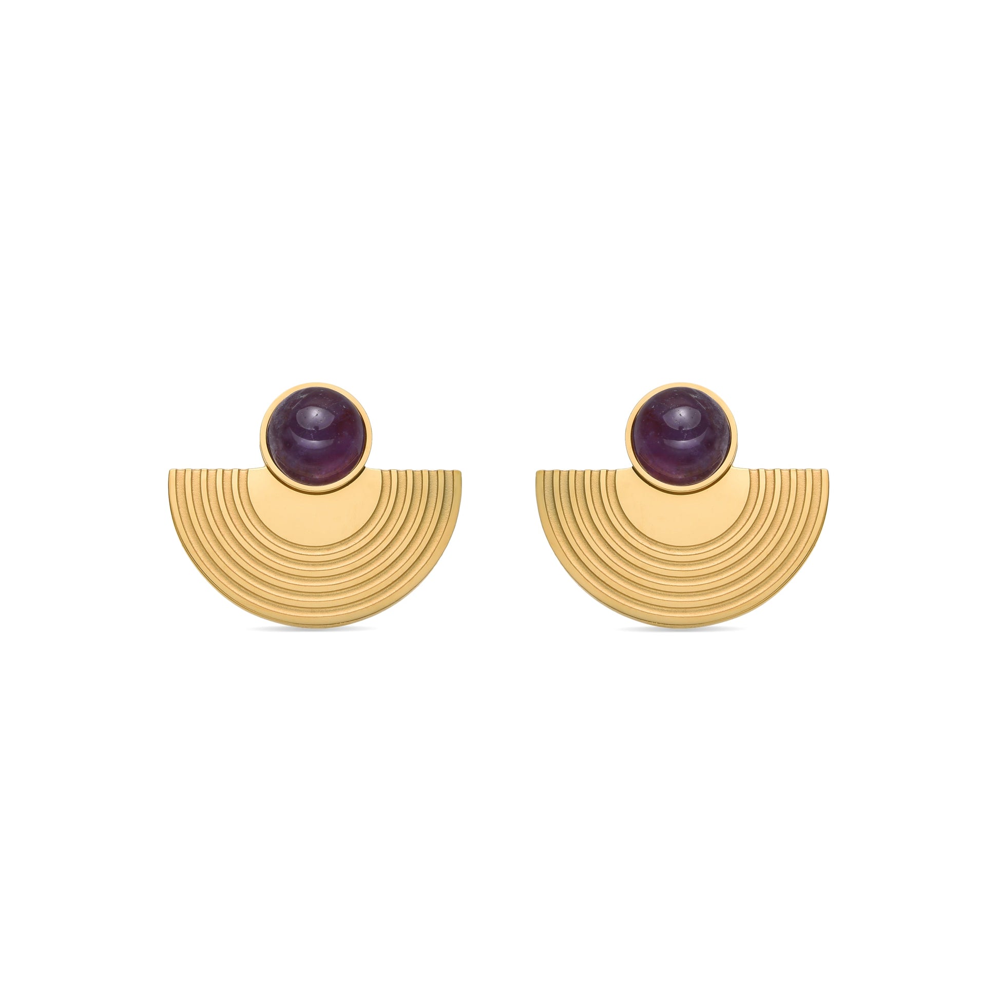 Pendientes de acero Koru con Cuarzo Hidrotermal Amatista acabado oro 18k. El estilo Boho es una estética de espíritu libre que mezcla diferentes culturas y expresiones artísticas en un estilo ecléctico con énfasis en los elementos orgánicos y la naturaleza.