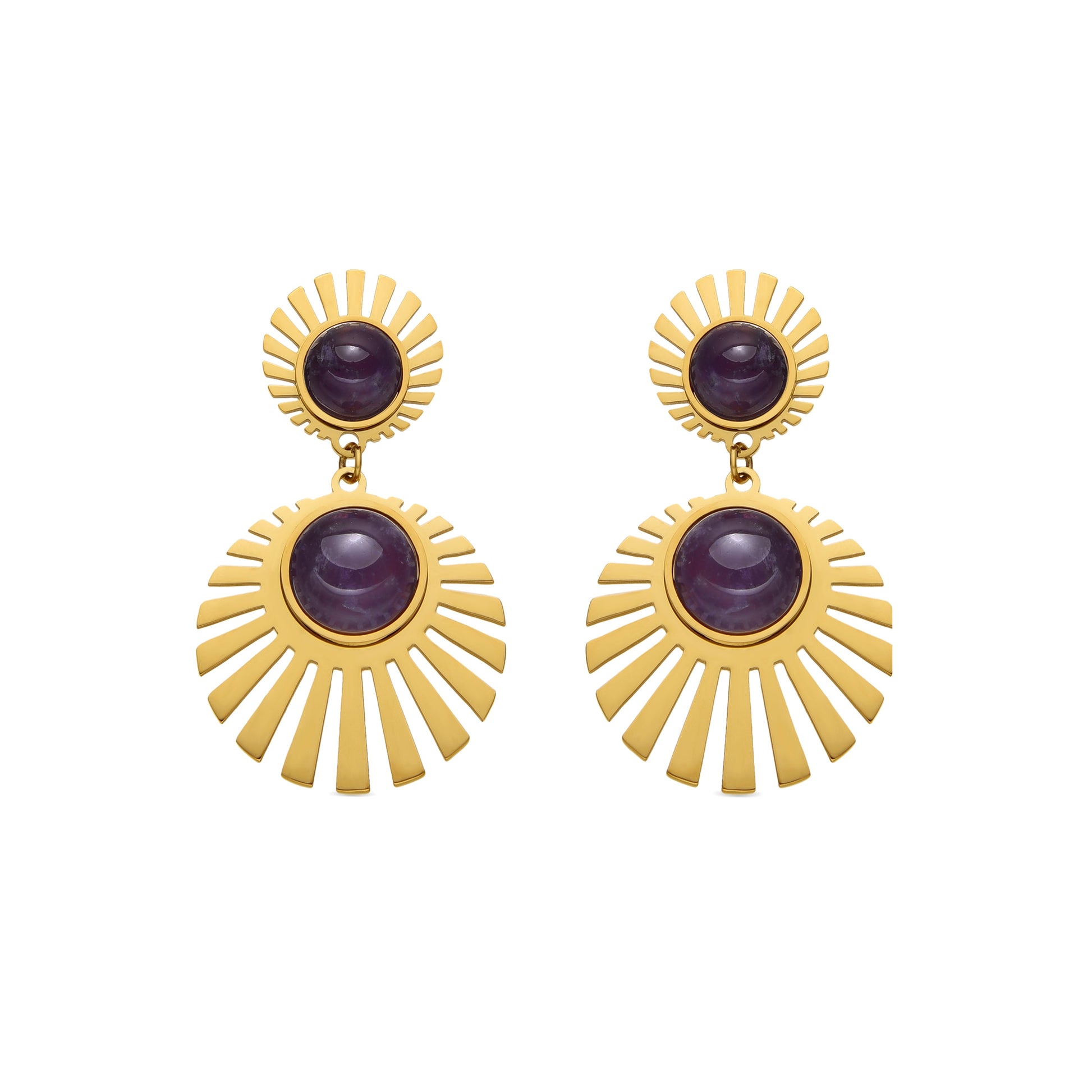 Pendientes de acero Zuxia con Cuarzo Hidrotermal Amatista acabado oro 18k. El estilo Boho es una estética de espíritu libre que mezcla diferentes culturas y expresiones artísticas en un estilo ecléctico con énfasis en los elementos orgánicos y la naturaleza.