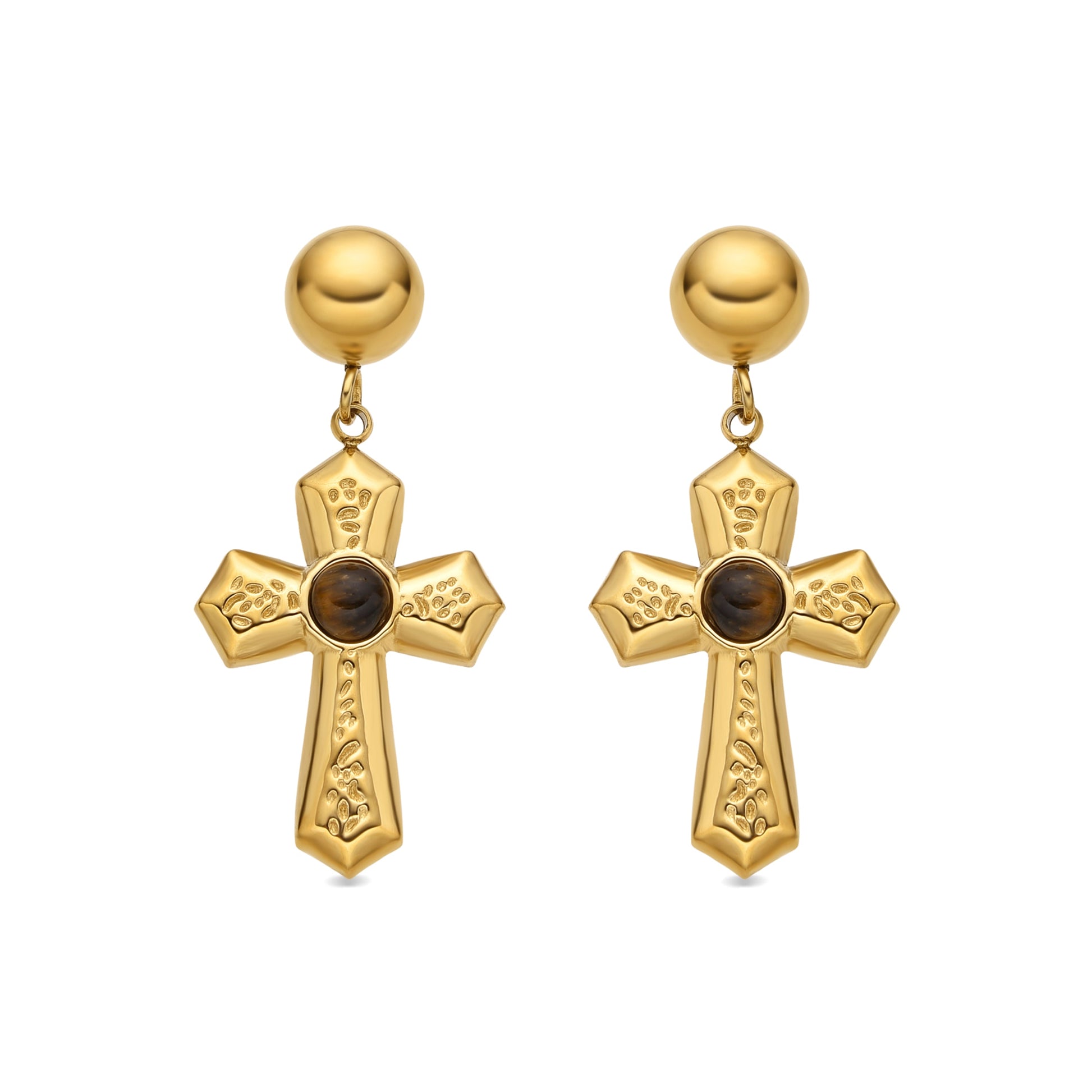 Pendientes de acero Anleh con Ojo de Tigre acabado oro 18k. El estilo Boho es una estética de espíritu libre que mezcla diferentes culturas y expresiones artísticas en un estilo ecléctico con énfasis en los elementos orgánicos y la naturaleza.