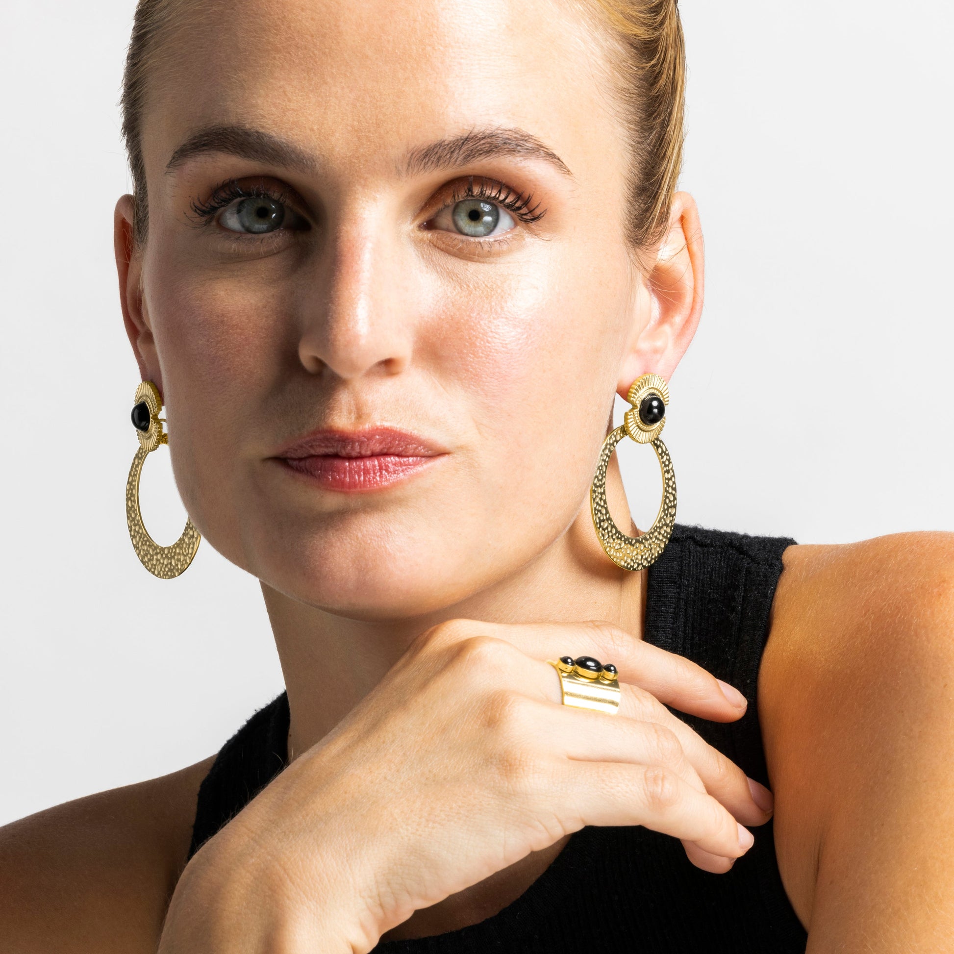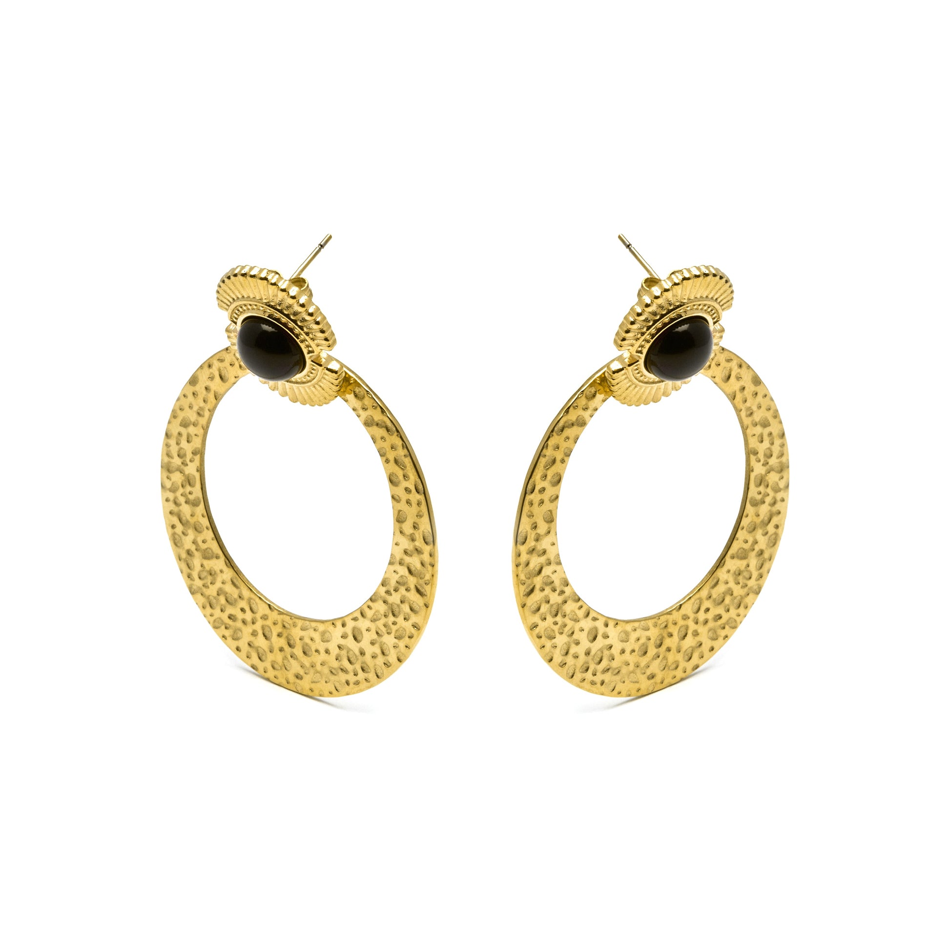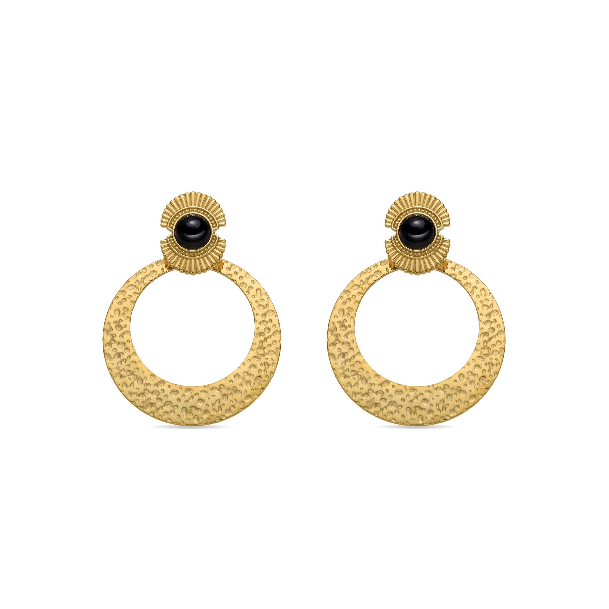 Pendientes de acero Noraf con Onix acabado oro 18k. El estilo Boho es una estética de espíritu libre que mezcla diferentes culturas y expresiones artísticas en un estilo ecléctico con énfasis en los elementos orgánicos y la naturaleza.