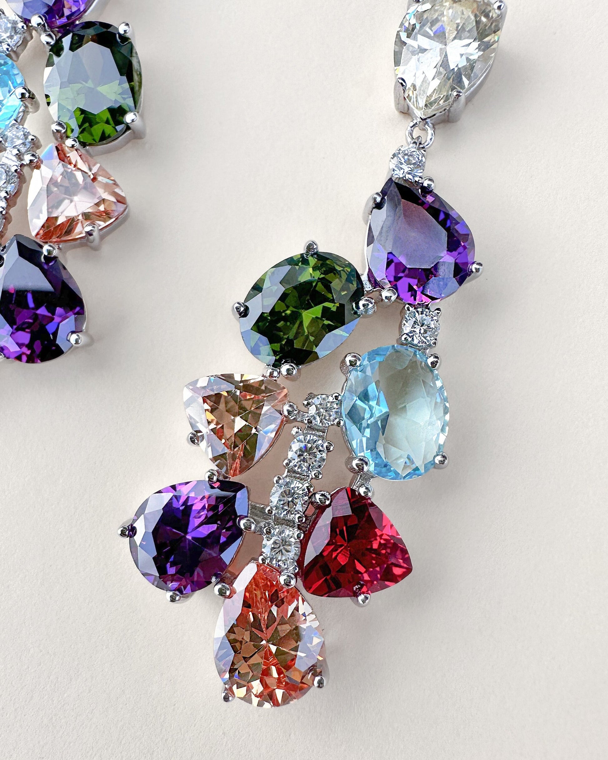 Este diseño de Sibela caracteriza por los seis colores protagonista que lo decoran: azul aguamarina, verde olivine, rojo rubí, color champagne, amatista y las gemas blancas semi-preciosas. Elaborado en plata de 1ª ley 925 milésimas con un baño de rodio. Las piedras en talla circular dan un giro a la pieza apartándole luz y brillo, y convirtiéndola en una delicada y sutil joya.