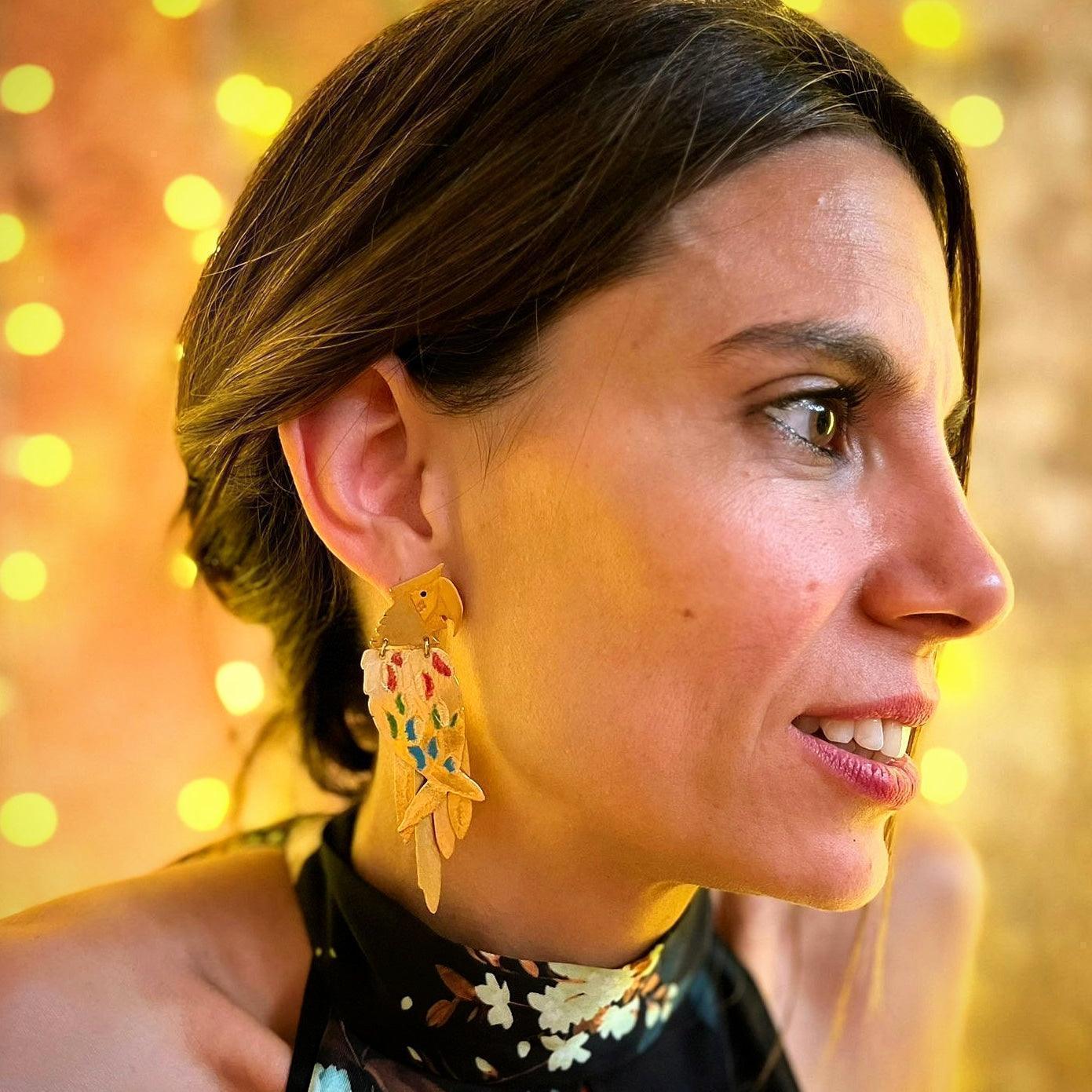Pendientes texturizados con forma de loro fabricados a mano y coloreables con resina natural.