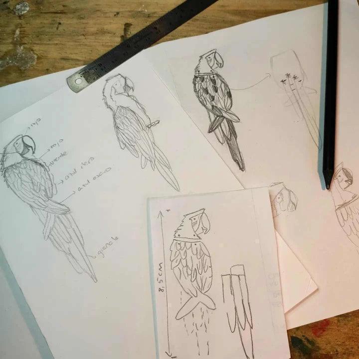 Investigué y dibujé muchos loros hasta dar con el que me gustaba y también busqué distintas formas de darle color a sus plumas, con tinta de acuarela, fuego, resina y polvo de oro.