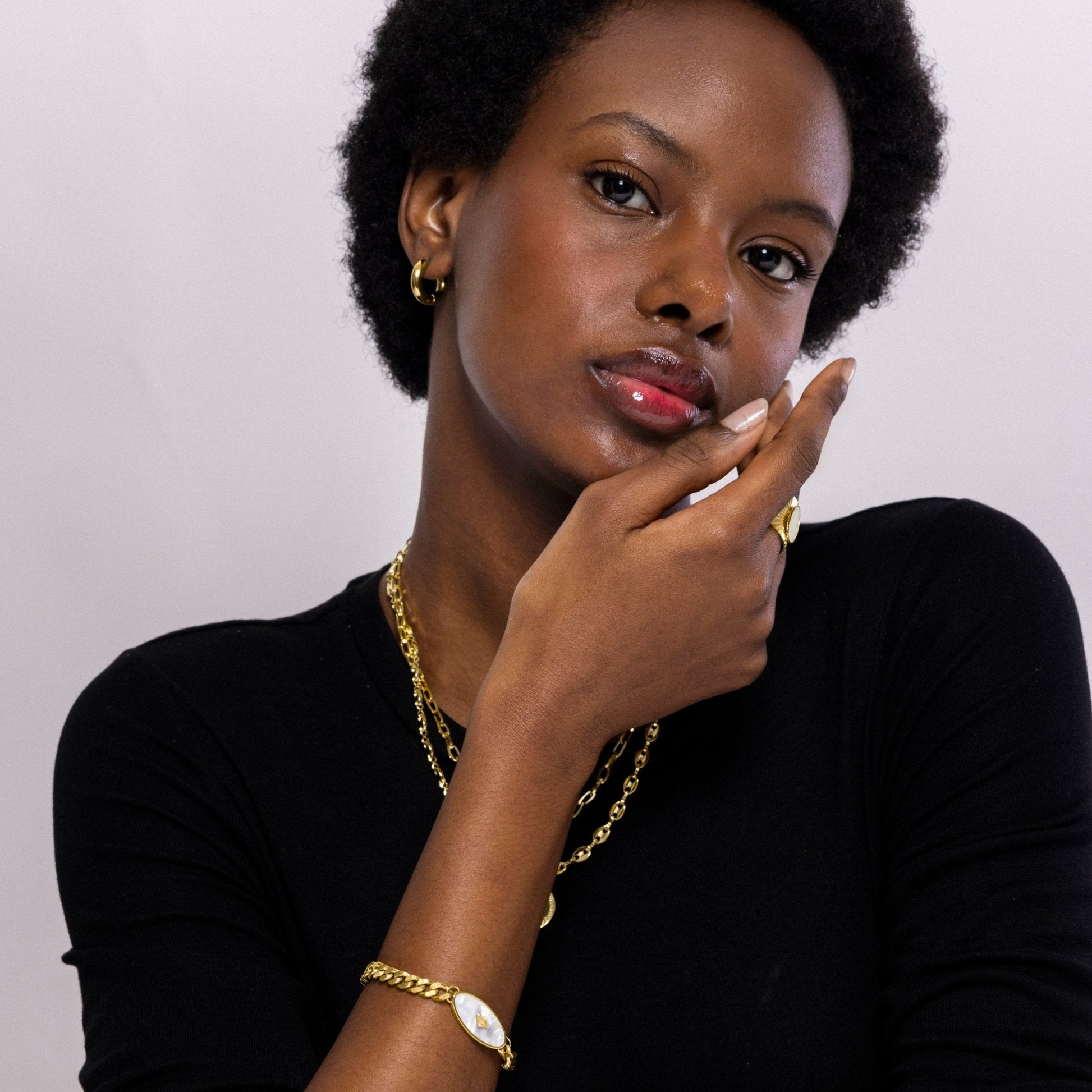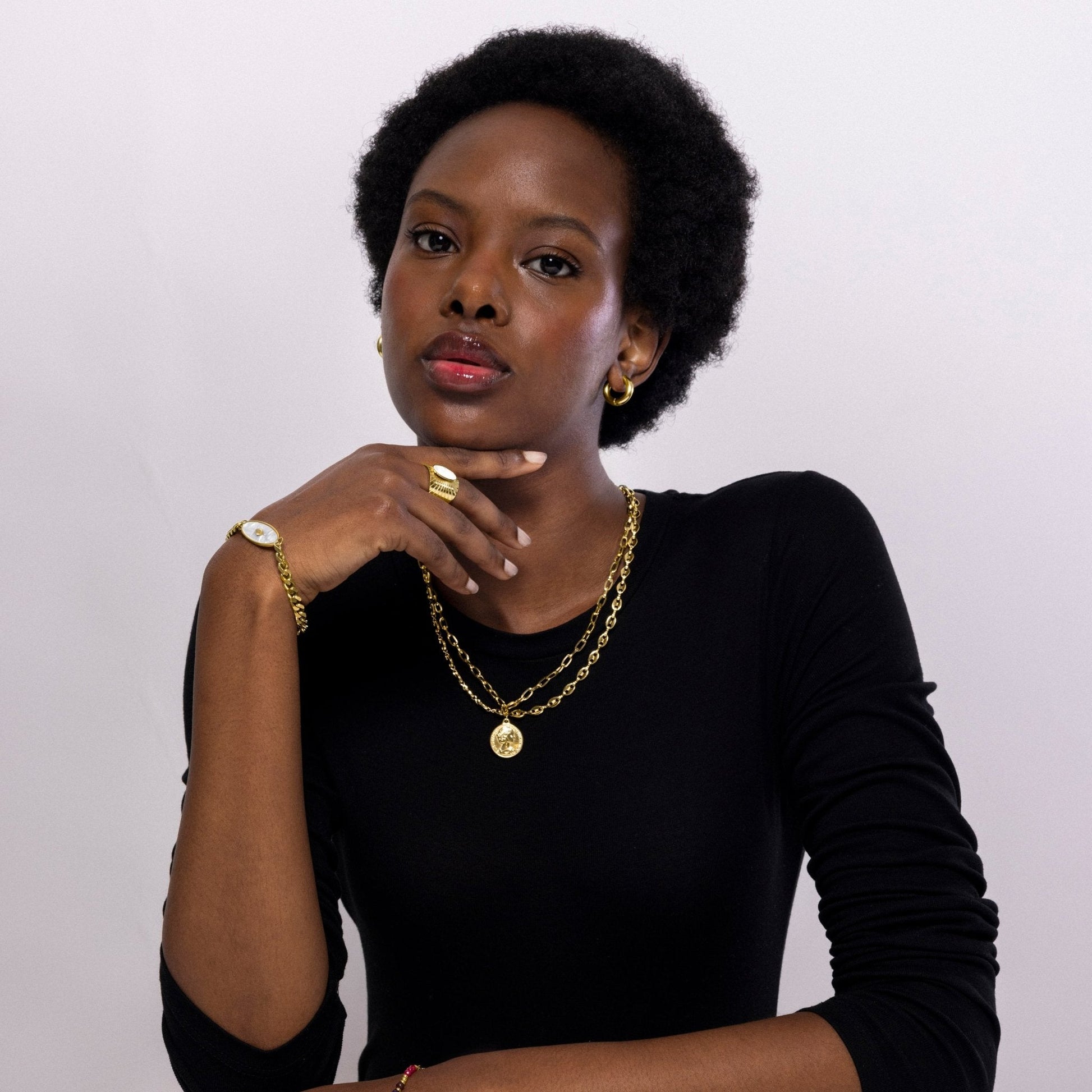 Pulsera de acero Anleh de Madreperla Blanca acabada en oro amarillo de 18k. El estilo Boho es una estética de espíritu libre que mezcla diferentes culturas y expresiones artísticas en un estilo ecléctico con énfasis en los elementos orgánicos y la naturaleza.