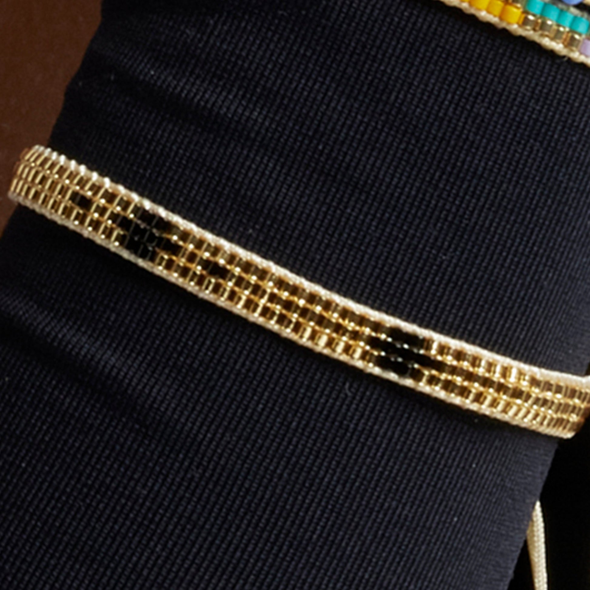 Pulsera Sagruk con Cristal Negro acabado oro 18k. El estilo Boho es una estética de espíritu libre que mezcla diferentes culturas y expresiones artísticas en un estilo ecléctico con énfasis en los elementos orgánicos y la naturaleza.