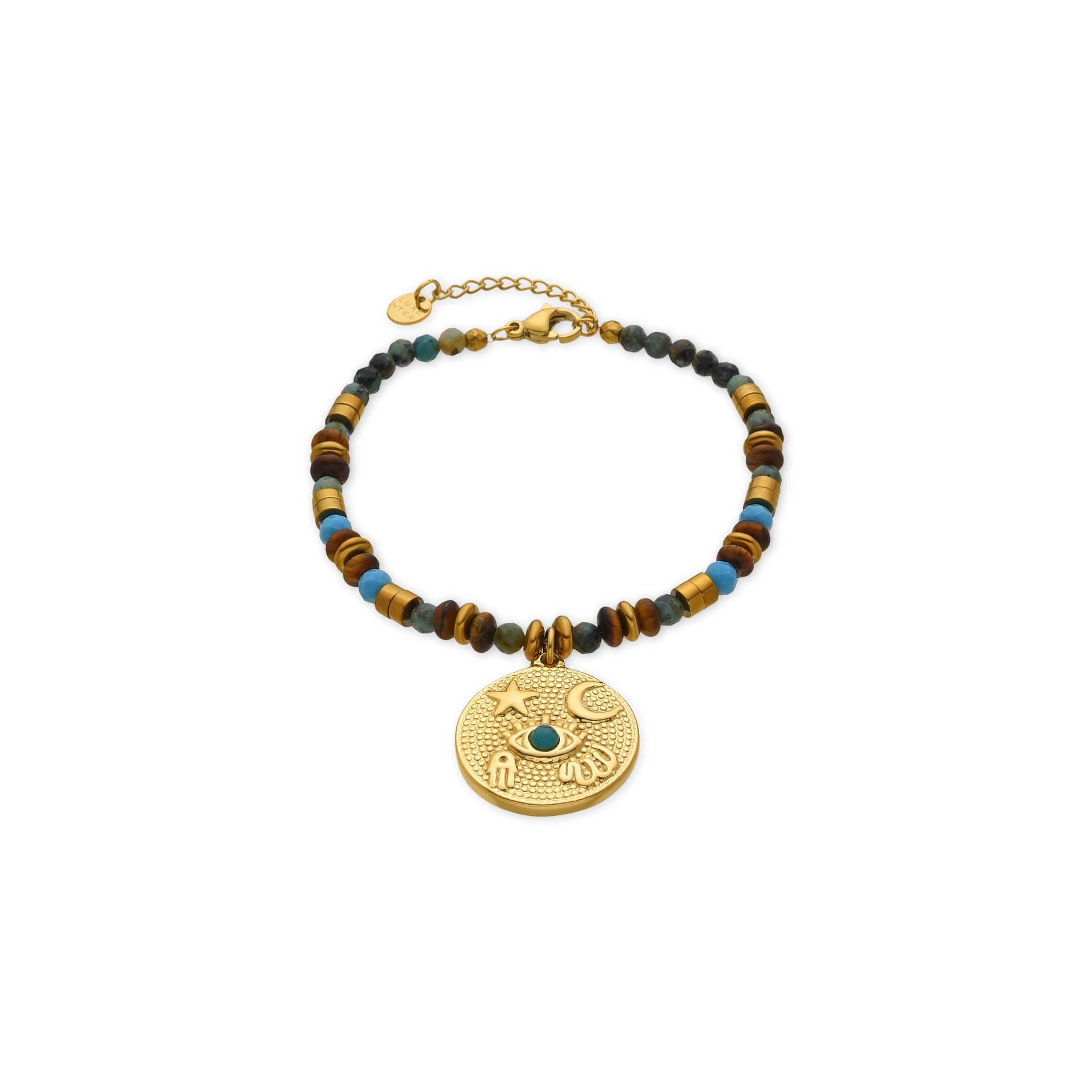 Pulsera de acero Salki con Multicolor Piedra Natural acabado oro 18k. El estilo Boho es una estética de espíritu libre que mezcla diferentes culturas y expresiones artísticas en un estilo ecléctico con énfasis en los elementos orgánicos y la naturaleza.
