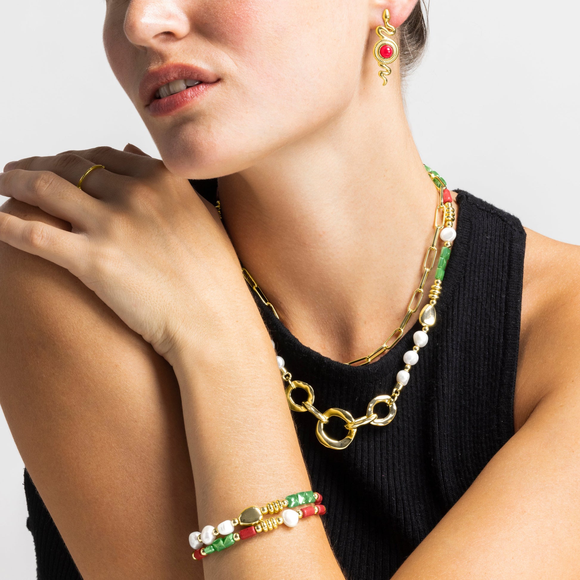 Pulsera de metal Kany con Perla Blanca acabado oro 18k. El estilo Boho es una estética de espíritu libre que mezcla diferentes culturas y expresiones artísticas en un estilo ecléctico con énfasis en los elementos orgánicos y la naturaleza.