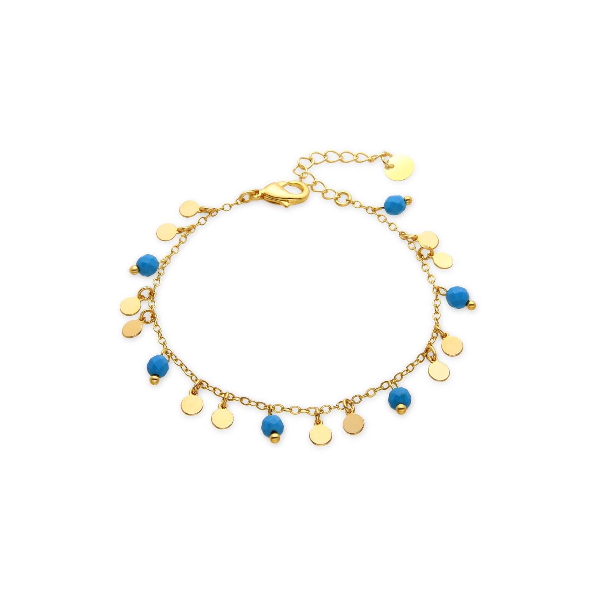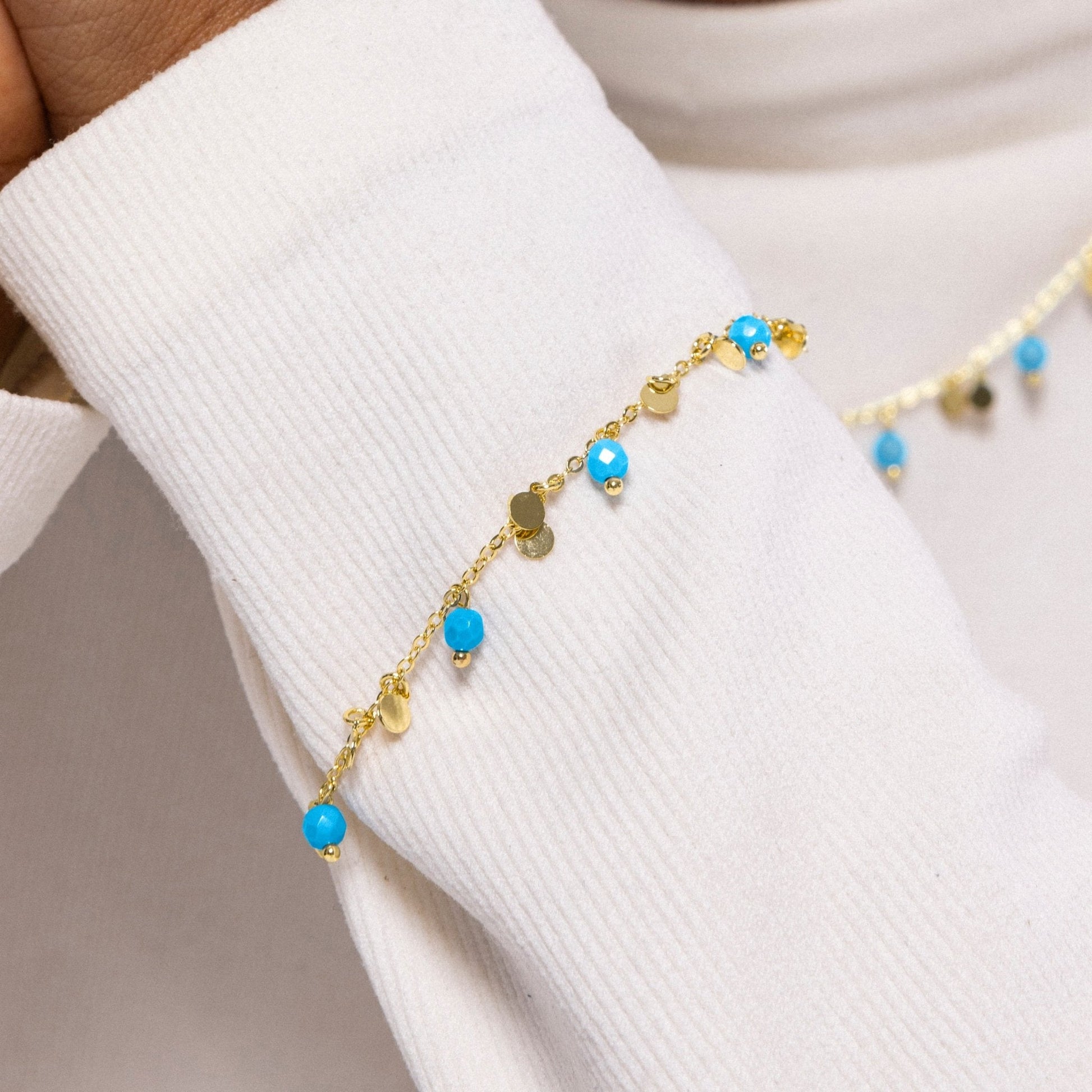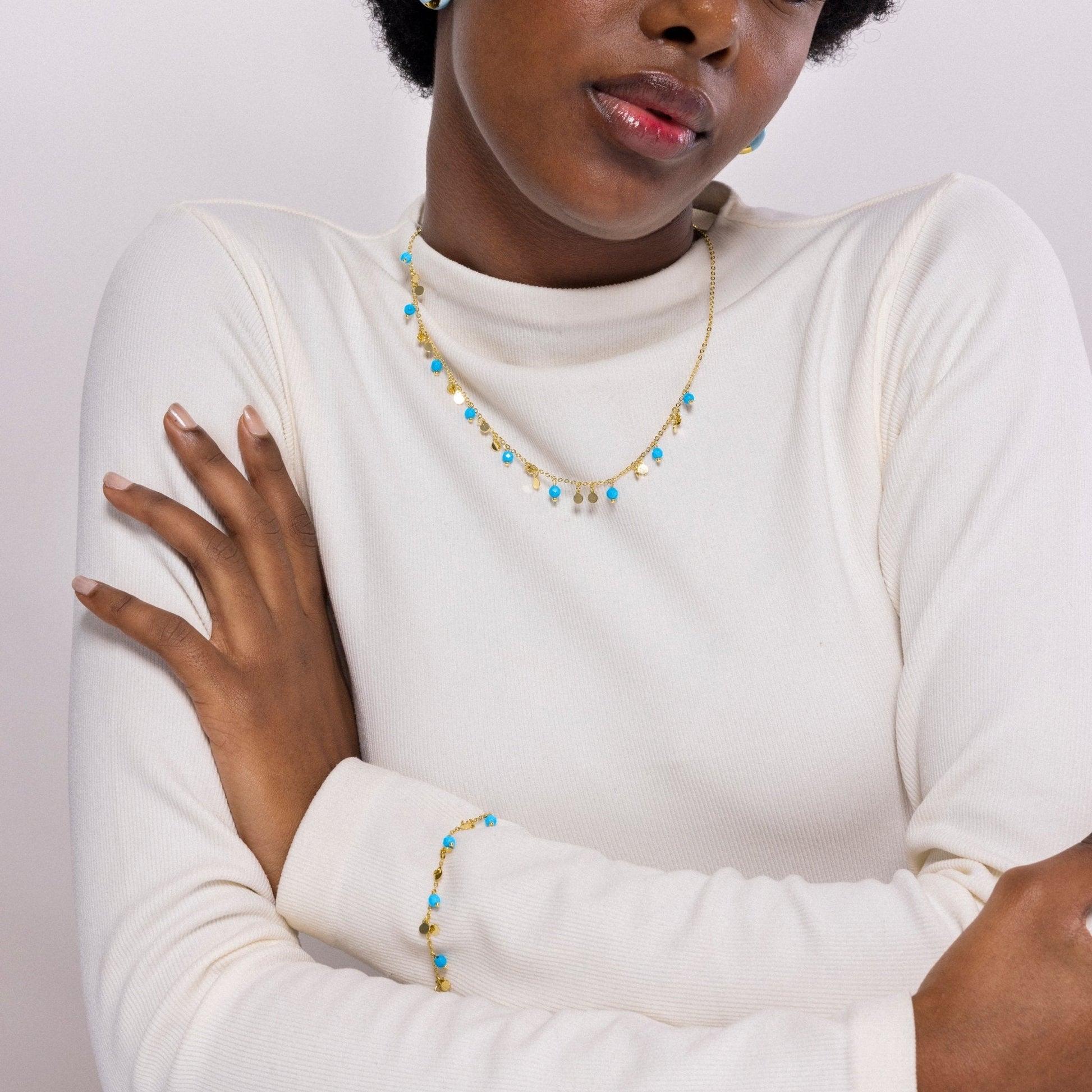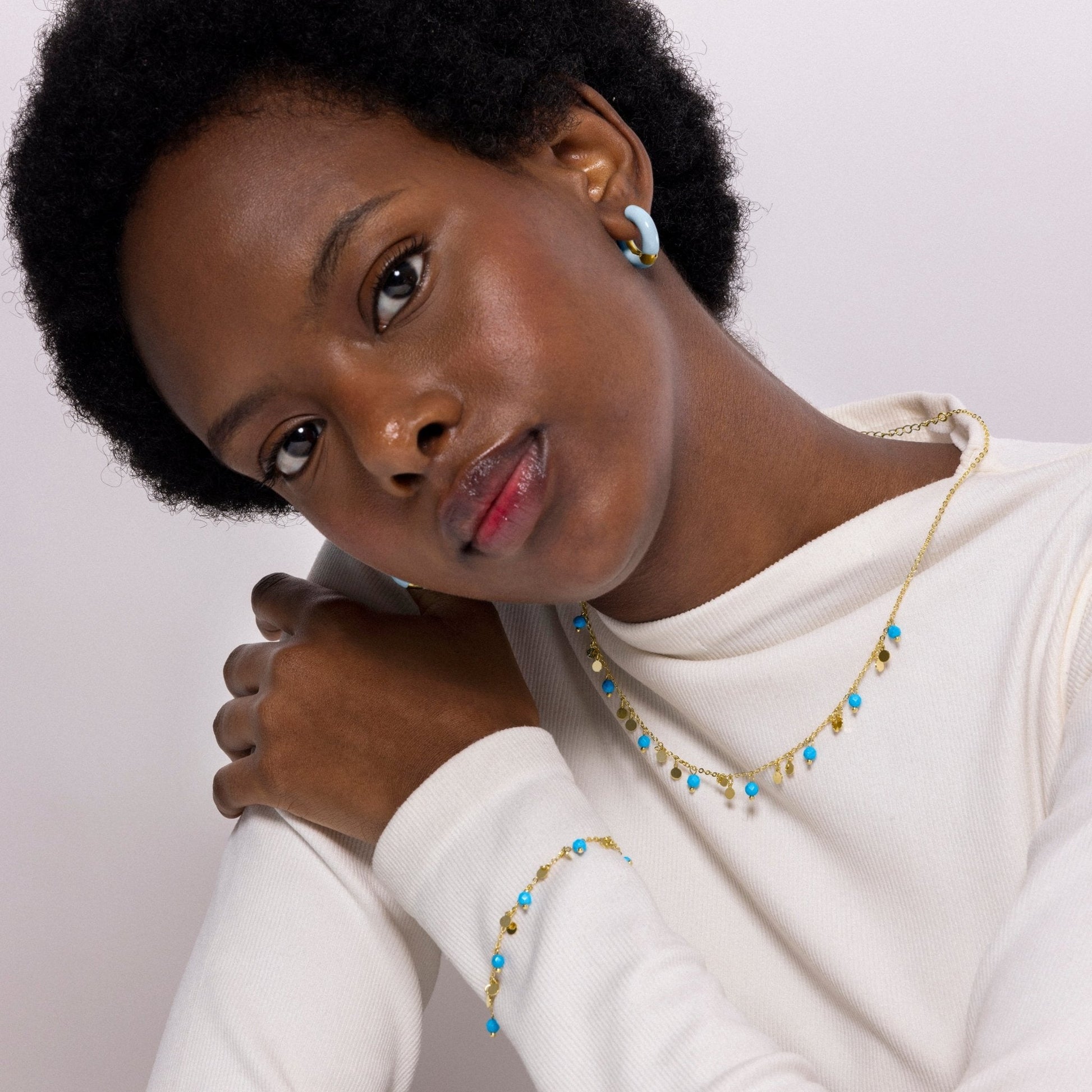 Pulsera de metal Fawya de Turquesa acabada en oro amarillo de 18k. El estilo Boho es una estética de espíritu libre que mezcla diferentes culturas y expresiones artísticas en un estilo ecléctico con énfasis en los elementos orgánicos y la naturaleza.