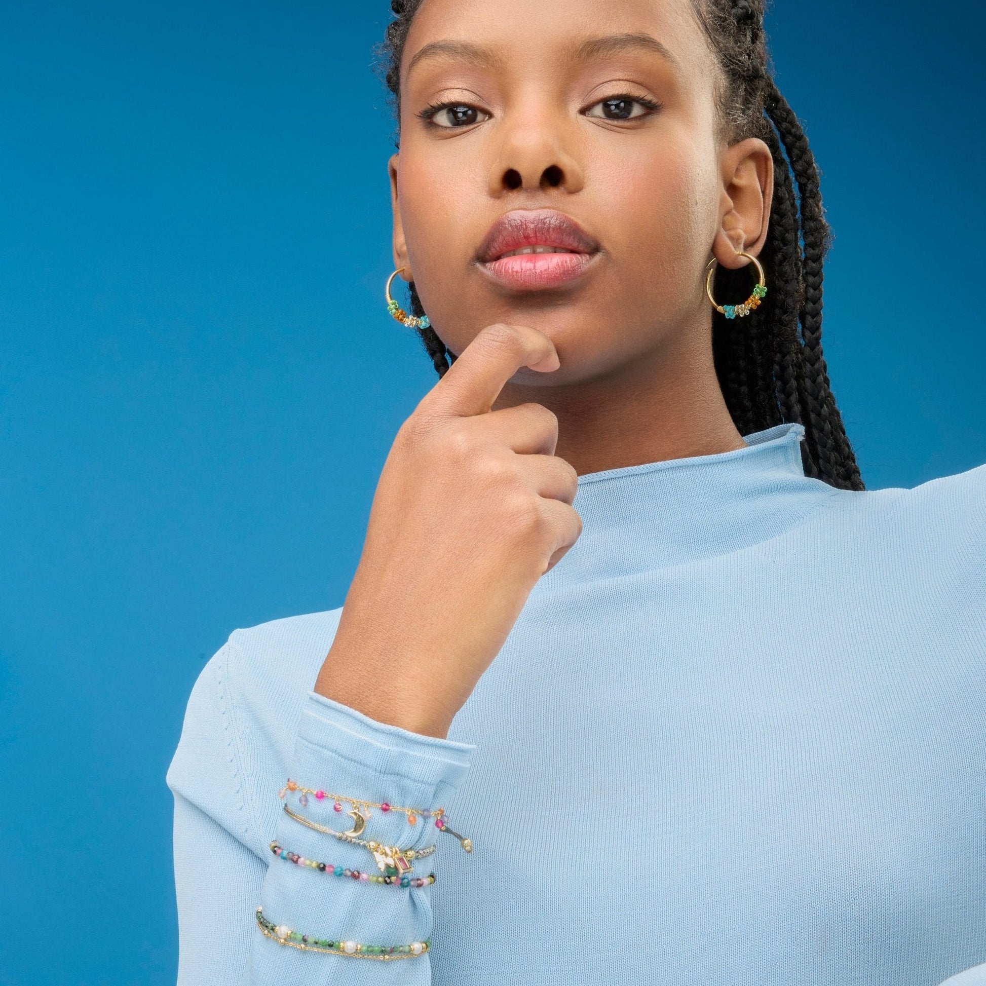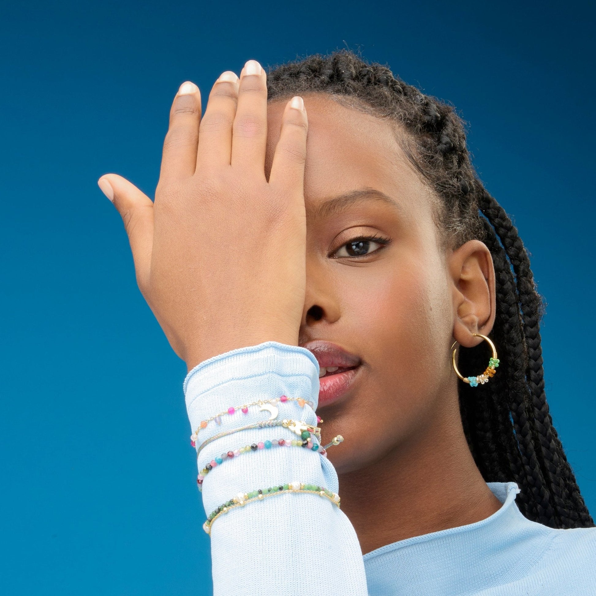 Pulsera de metal Rayja de Perla Blanca acabada en oro amarillo de 18k. El estilo Boho es una estética de espíritu libre que mezcla diferentes culturas y expresiones artísticas en un estilo ecléctico con énfasis en los elementos orgánicos y la naturaleza.